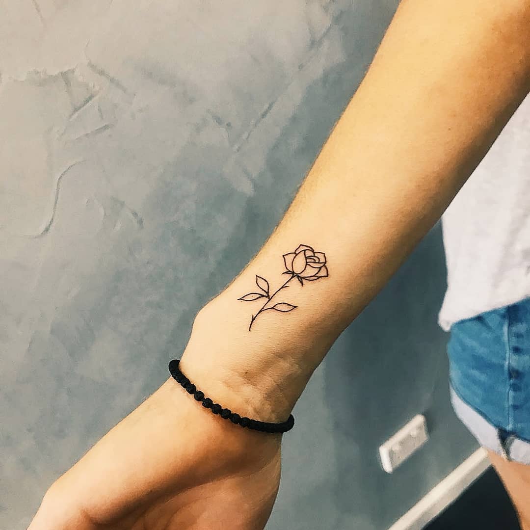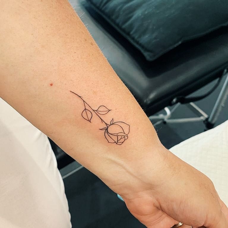 This image captures the elegance of a single-line rose tattoo, gracefully placed on the wrist. The delicate design brings out both beauty and simplicity, making it a perfect choice for someone seeking subtle art. For those considering a wrist tattoo, choosing a meaningful symbol can add personal significance to the design.