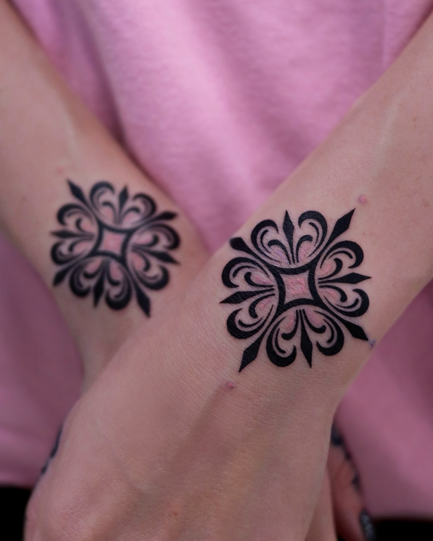 The image showcases a pair of beautifully symmetrical tattoos on each wrist, creating a mesmerizing pattern that draws the eye. The intricate design feels both bold and elegant, making a striking statement. For those considering wrist tattoos, choosing a design with symmetry can add a unique and harmonious touch to your personal style.