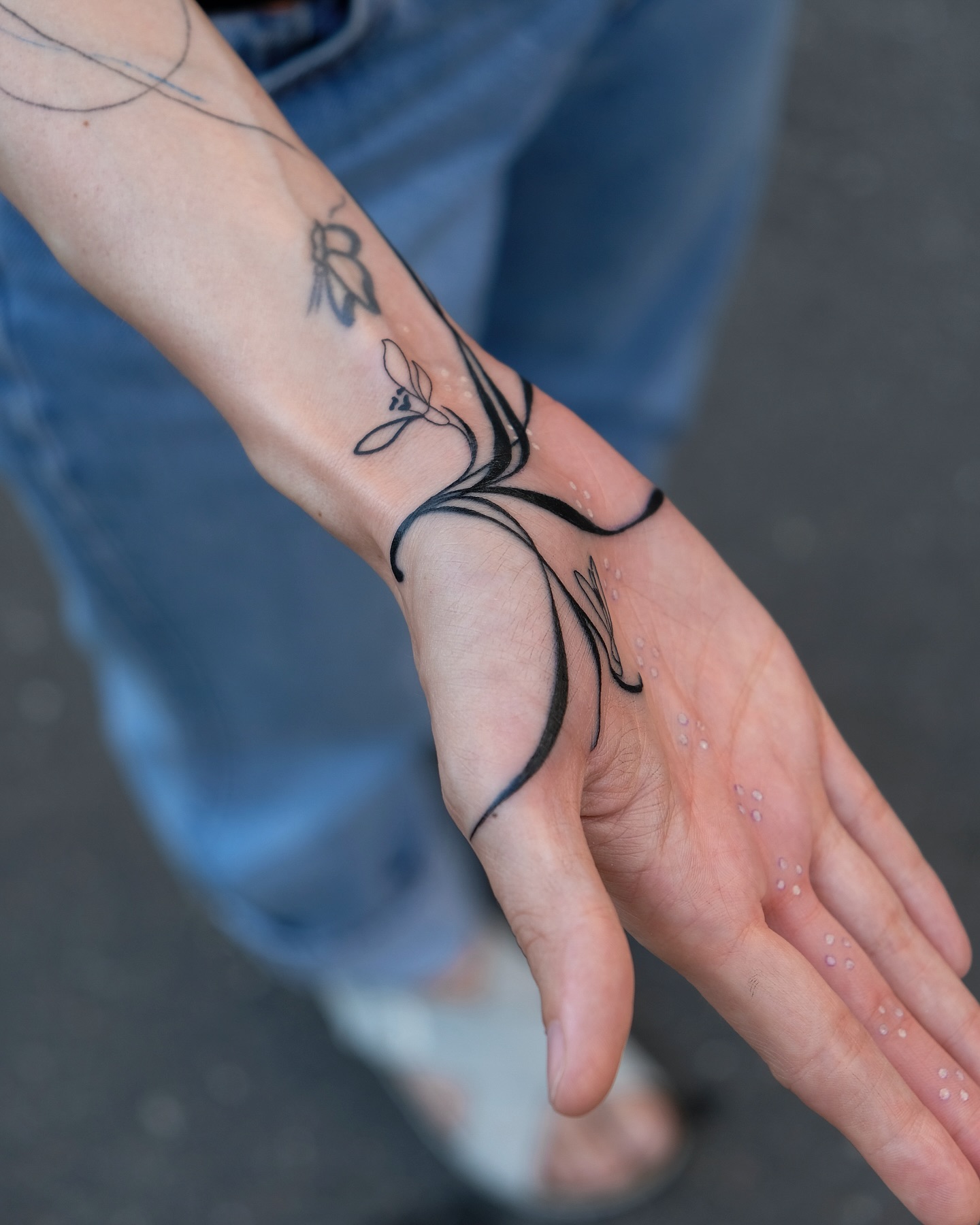 This wrist tattoo beautifully captures the graceful flow of nature with its elegant design. The black lines and delicate leaves seem to dance across the skin, creating a mesmerizing visual effect. For those considering wrist tattoos, choosing a design that naturally complements the wrist’s shape can enhance its overall charm.