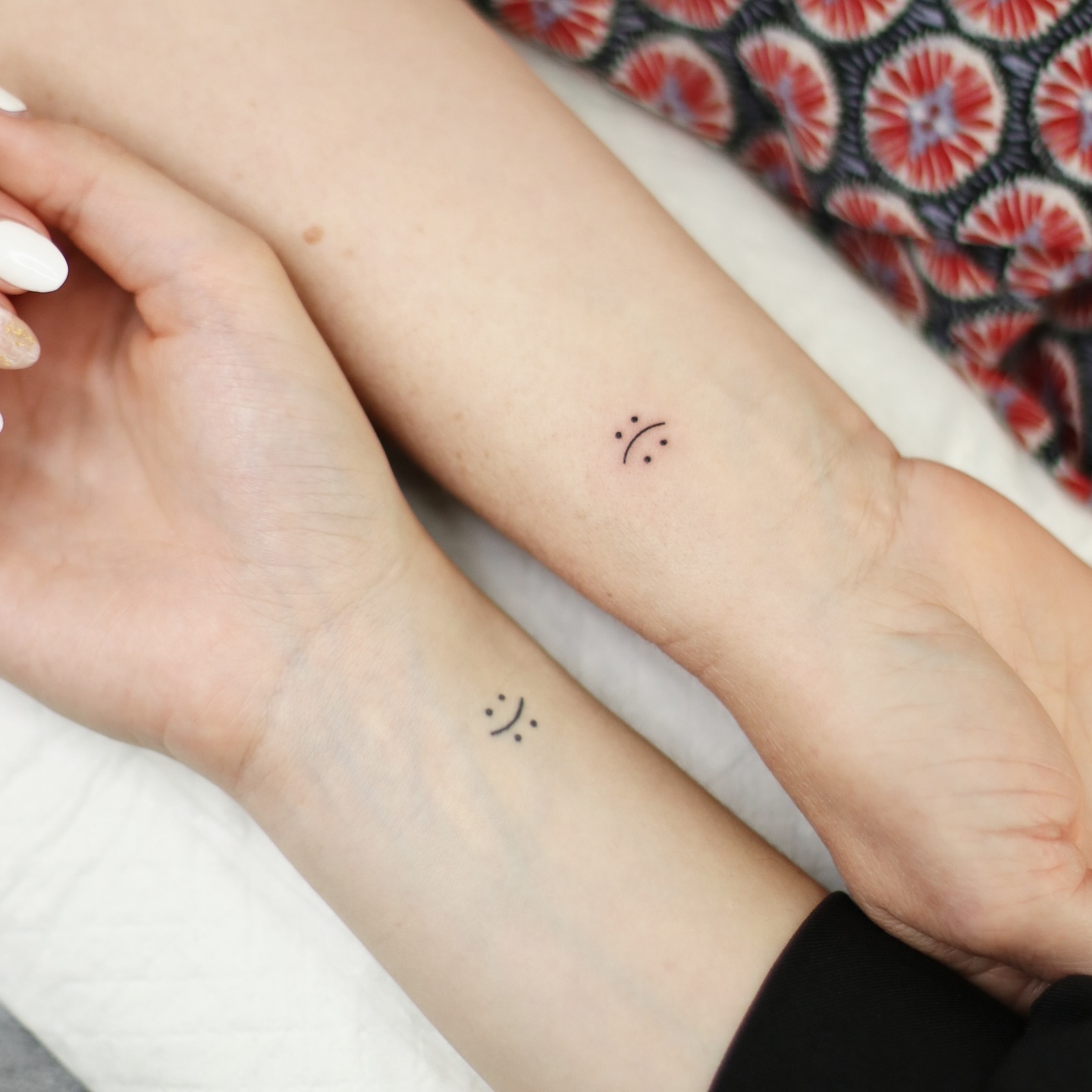 This image captures a delightful moment between two friends, each sporting a matching wrist tattoo that symbolizes their connection. The simple yet meaningful design turns their wrists into a canvas of friendship. When choosing a wrist tattoo, consider a design that speaks to shared experiences or emotions, turning the ink into a lasting bond.