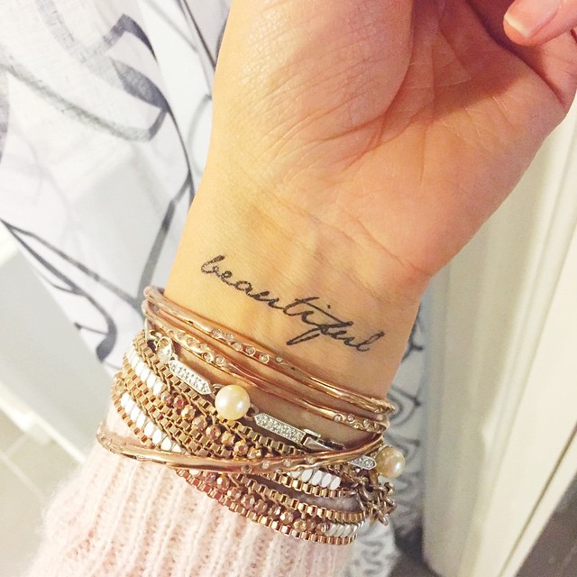 This image captures a delicate script tattoo that simply reads “beautiful,” nestled among a collection of elegant bracelets. The combination of soft metal tones and pearls creates a lovely contrast against the skin, making the tattoo stand out even more. For those considering wrist tattoos, pairing them with jewelry can add a personal touch to your style.