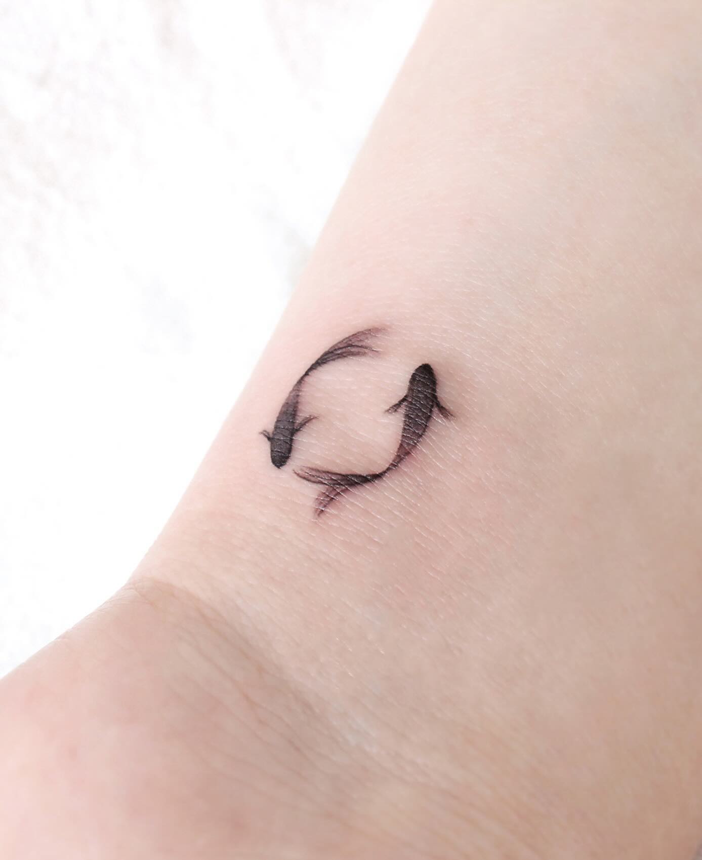 This wrist tattoo features two tiny fish gracefully circling each other, creating a sense of movement and harmony. The design is simple yet captivating, symbolizing balance and the flow of life. For those considering a wrist tattoo, choosing a theme that resonates with personal beliefs can make the art even more meaningful.