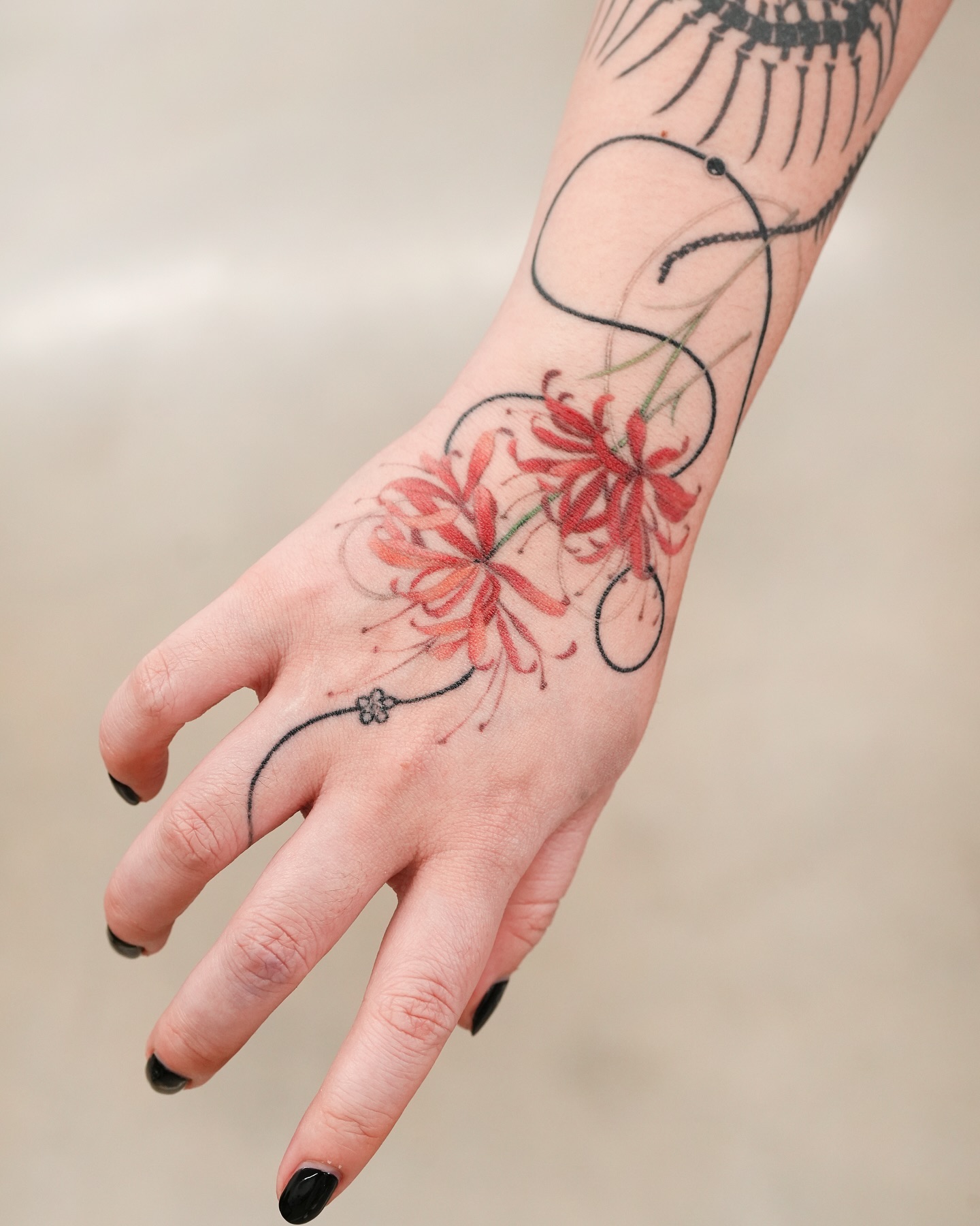 This image showcases a mesmerizing floral tattoo that elegantly wraps around the wrist and hand. The vibrant red petals contrast beautifully with the delicate black ink lines, creating a unique blend of colors and shapes. For those considering wrist tattoos, this design offers a stunning way to express personal style with both grace and flair.