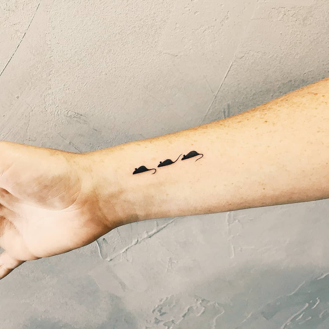 This delightful wrist tattoo features three tiny mice, each playfully following the other. The simplicity of the design brings out its charm, making it an endearing choice for those who love understated art. A wrist tattoo like this can be a subtle nod to childhood stories or personal memories, adding a touch of whimsy to everyday life.