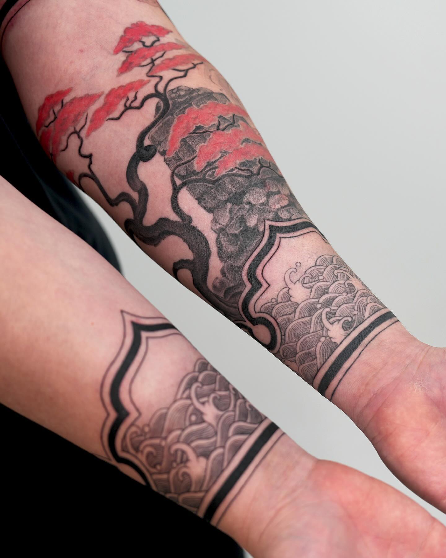 This tattoo beautifully captures the essence of nature with its intricate design of flowing patterns and bold colors. The red leaves and black branches create a striking contrast that draws the eye, making it a standout piece. For those considering wrist tattoos, incorporating elements of nature can add a personal touch that feels both timeless and unique.