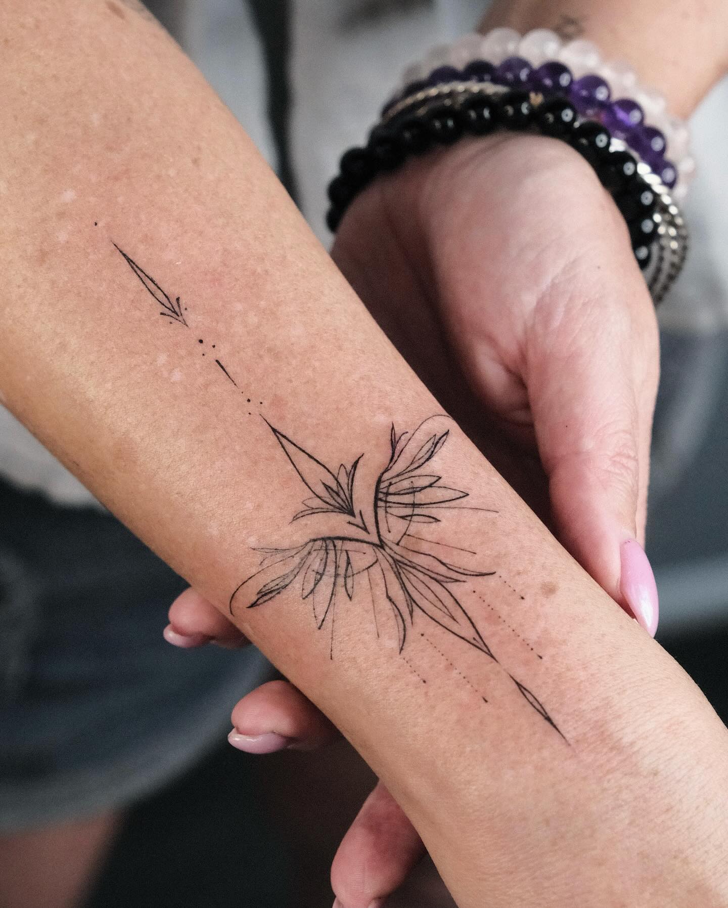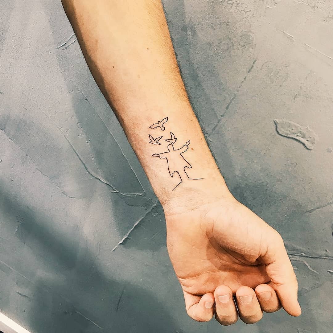 This wrist tattoo stands out with its minimalist design of a person and birds, capturing a sense of freedom and adventure. The delicate lines create a story of exploration, inviting viewers to imagine their own journeys. If you’re thinking of getting a wrist tattoo, consider how a simple design can convey profound meaning.