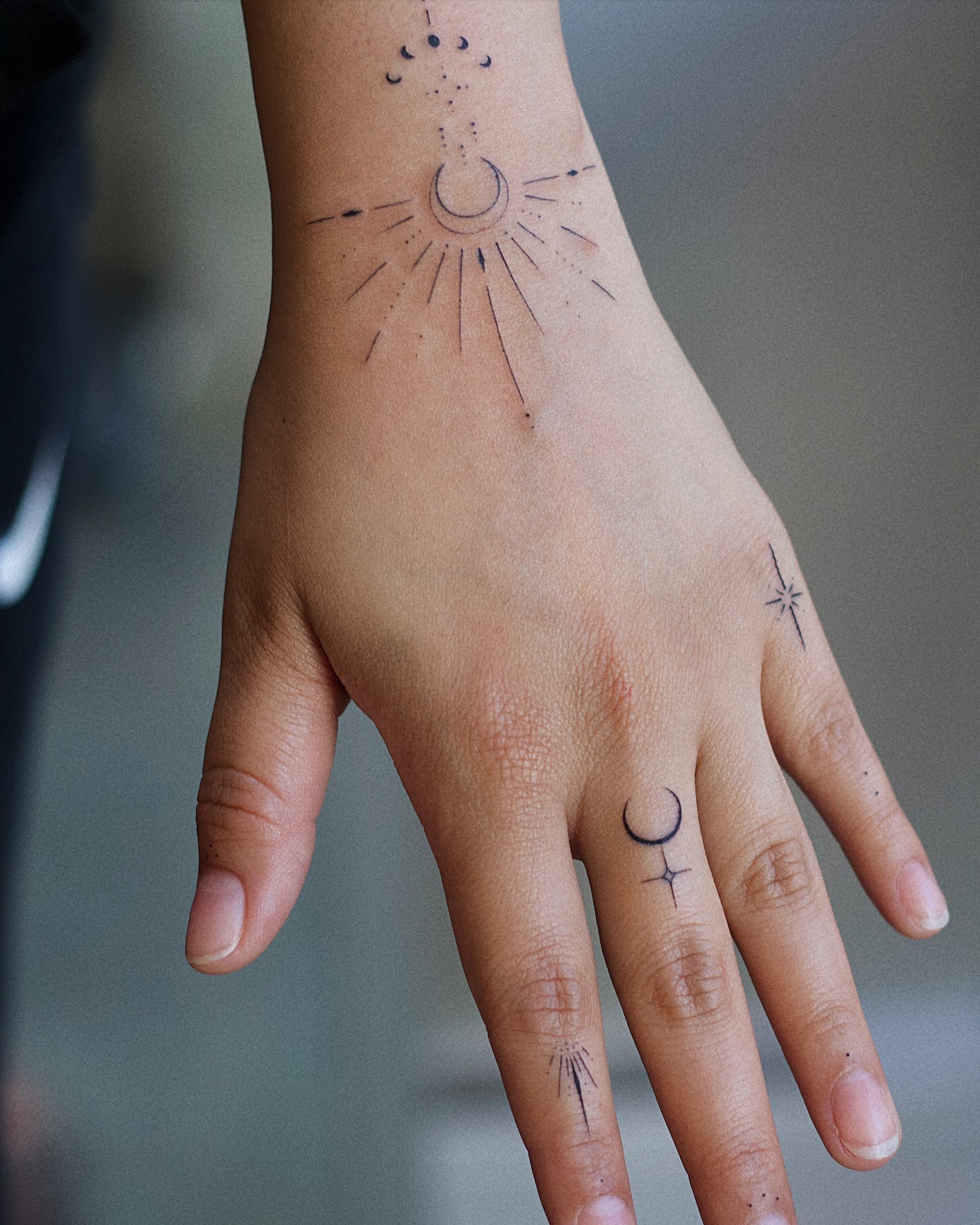 This enchanting wrist tattoo features a crescent moon surrounded by delicate rays, creating a celestial theme that’s both subtle and striking. The intricate design extends to the fingers, adding a touch of magic and mystery. For those seeking a unique way to express their love for the cosmos, this style offers an elegant and timeless choice.