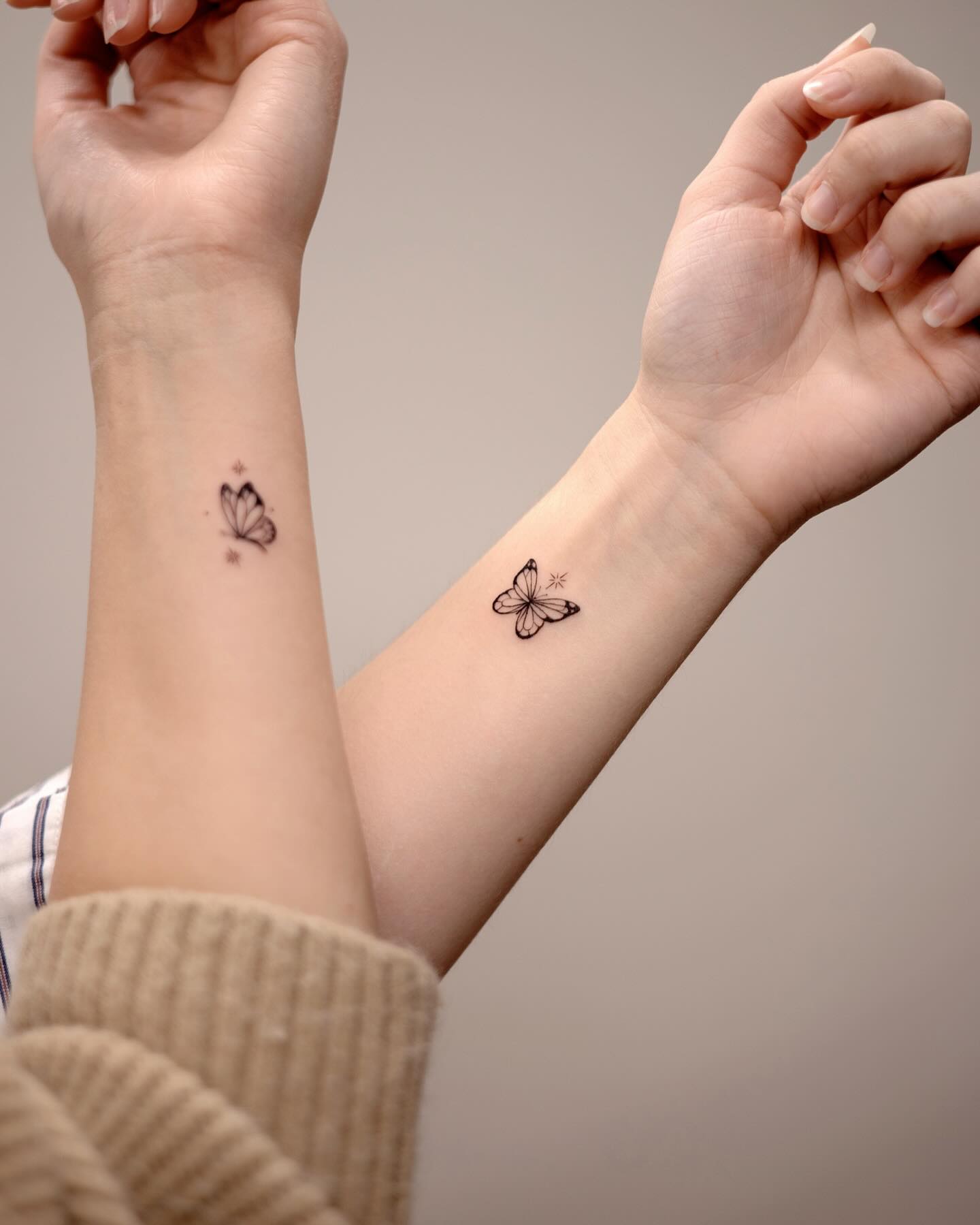 The delicate butterfly tattoos on the wrists add a touch of whimsy and grace, capturing the beauty of nature in a small, artful design. These tattoos symbolize transformation and freedom, making them a meaningful choice for anyone looking to express personal growth. A tip for butterfly tattoo lovers: consider adding subtle shading to enhance the wings’ intricate details.