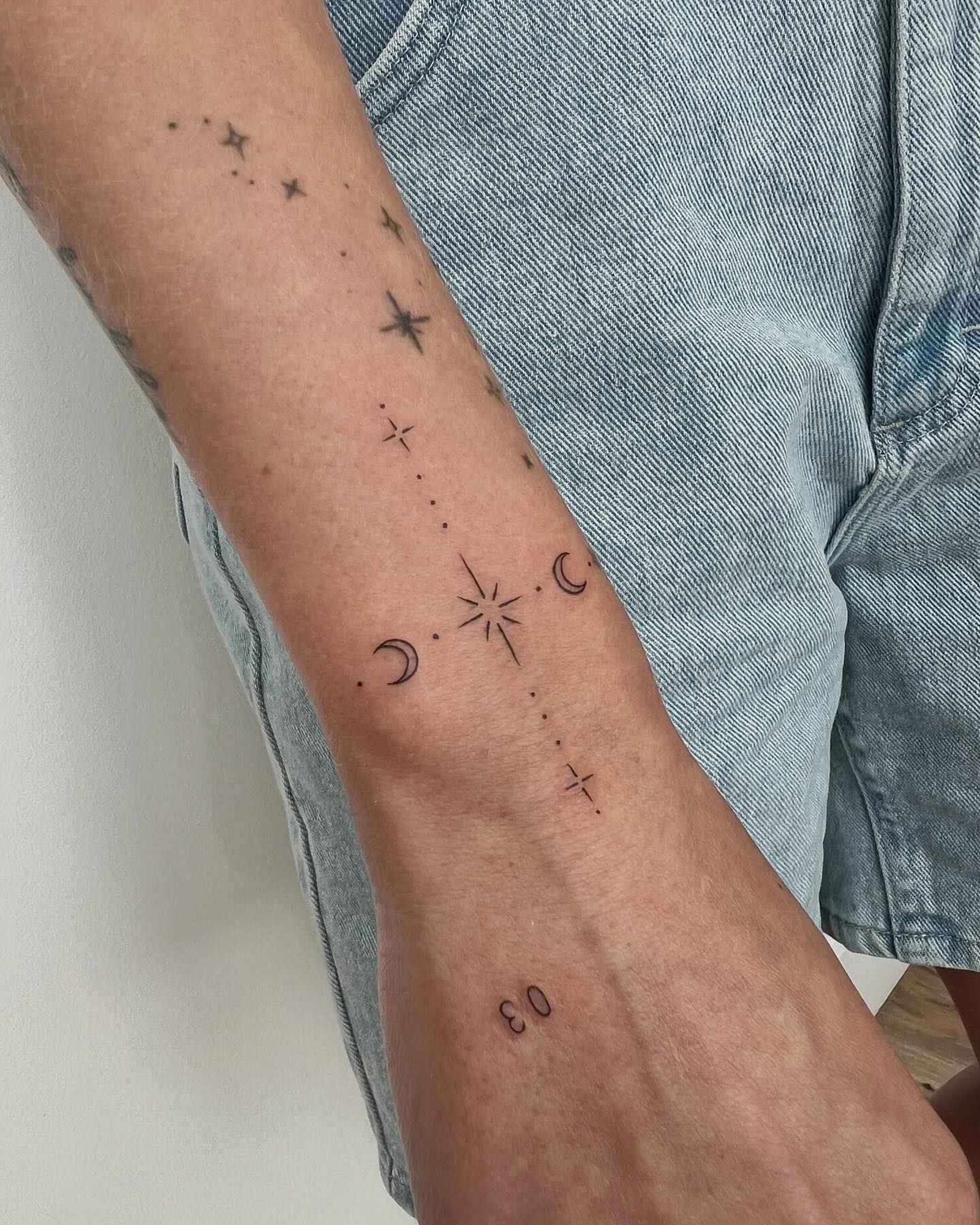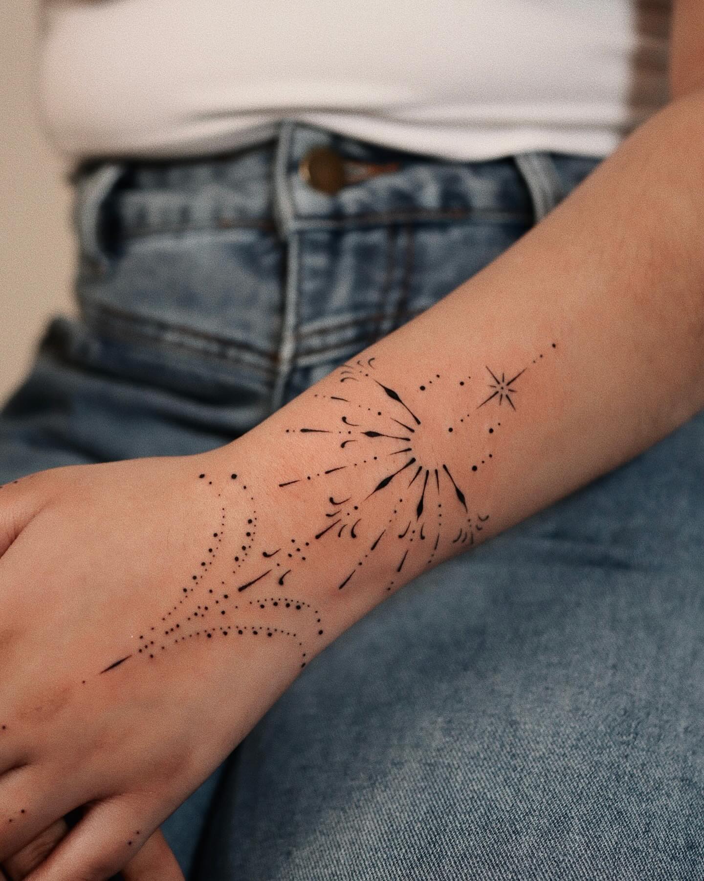 This wrist tattoo features a delicate array of stars, moons, and a compass-like starburst, creating a mesmerizing celestial scene. The design s simplicity adds a touch of elegance, making it both subtle and striking. Choosing a tattoo that reflects one’s love for the cosmos can be a constant reminder of the universe’s beauty.