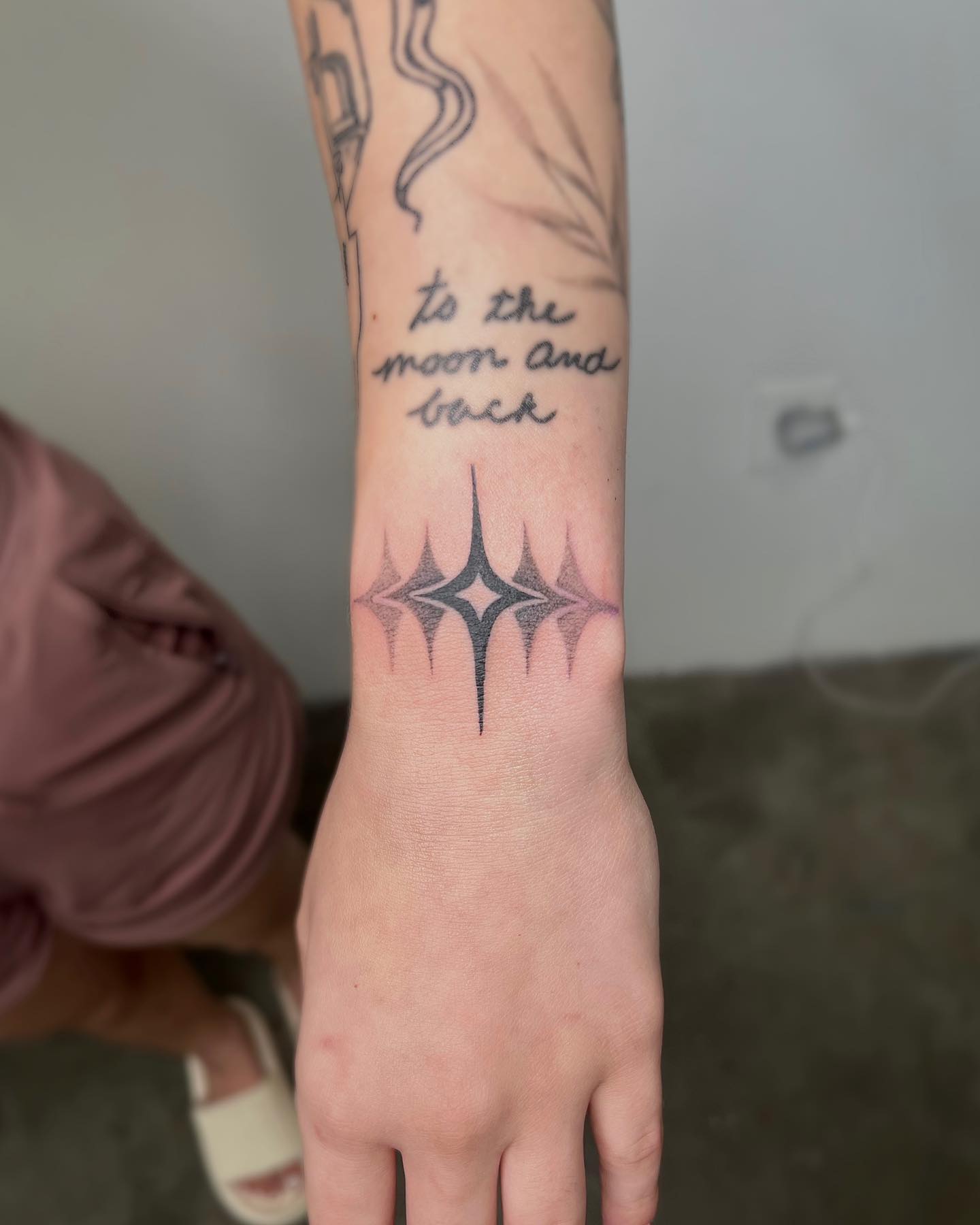 This wrist tattoo features a striking starburst pattern that captures attention with its bold lines and symmetry. Paired with a heartfelt phrase, “to the moon and back,” it tells a story of love and aspiration. Wrist tattoos like this can be a constant reminder of personal dreams and connections.