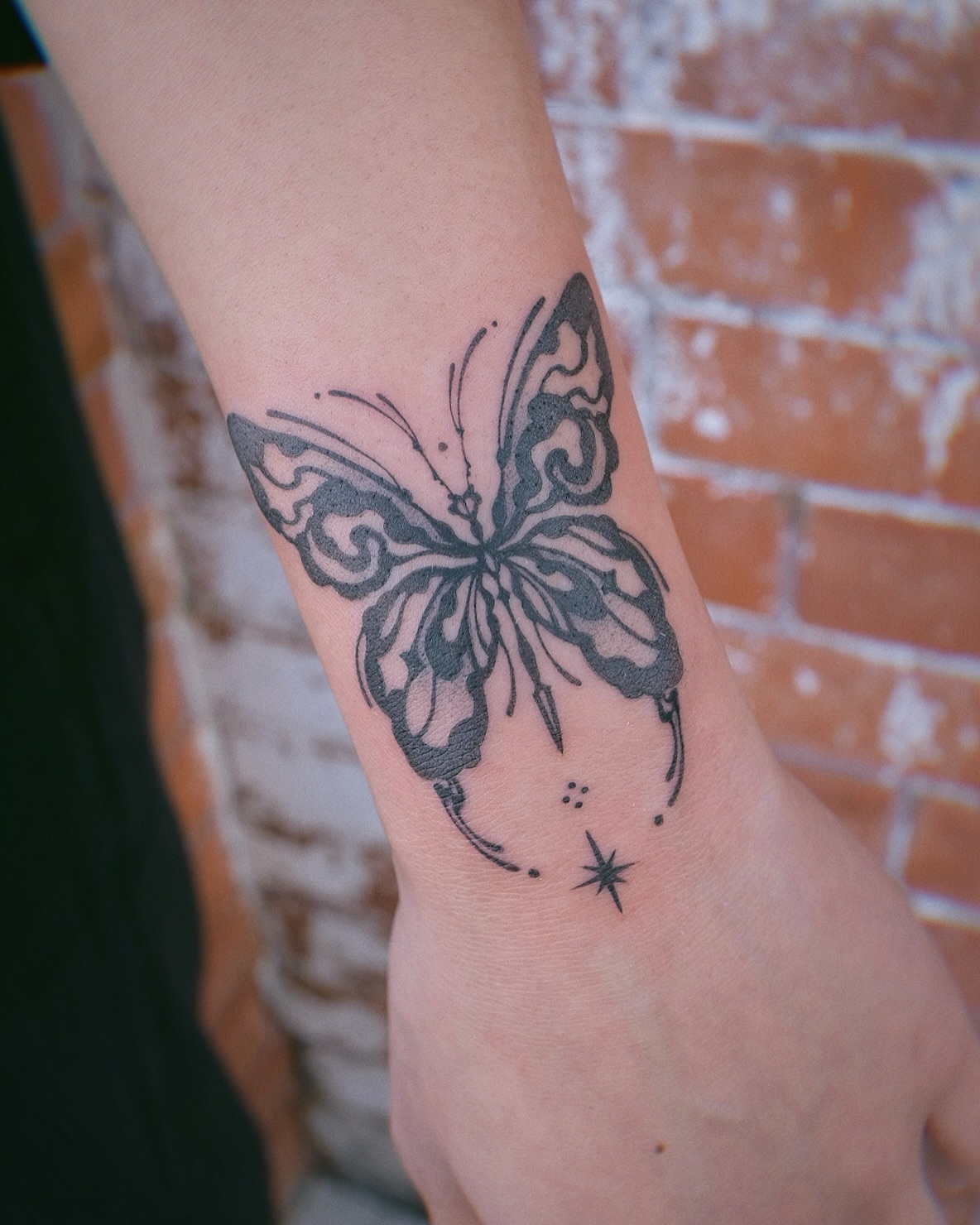 This enchanting butterfly tattoo gracefully adorns the wrist with its delicate wings and intricate details. The design captures the beauty of transformation and freedom, making it a perfect choice for those who love nature. For anyone considering a wrist tattoo, this elegant butterfly can be a daily reminder of beauty and change.
