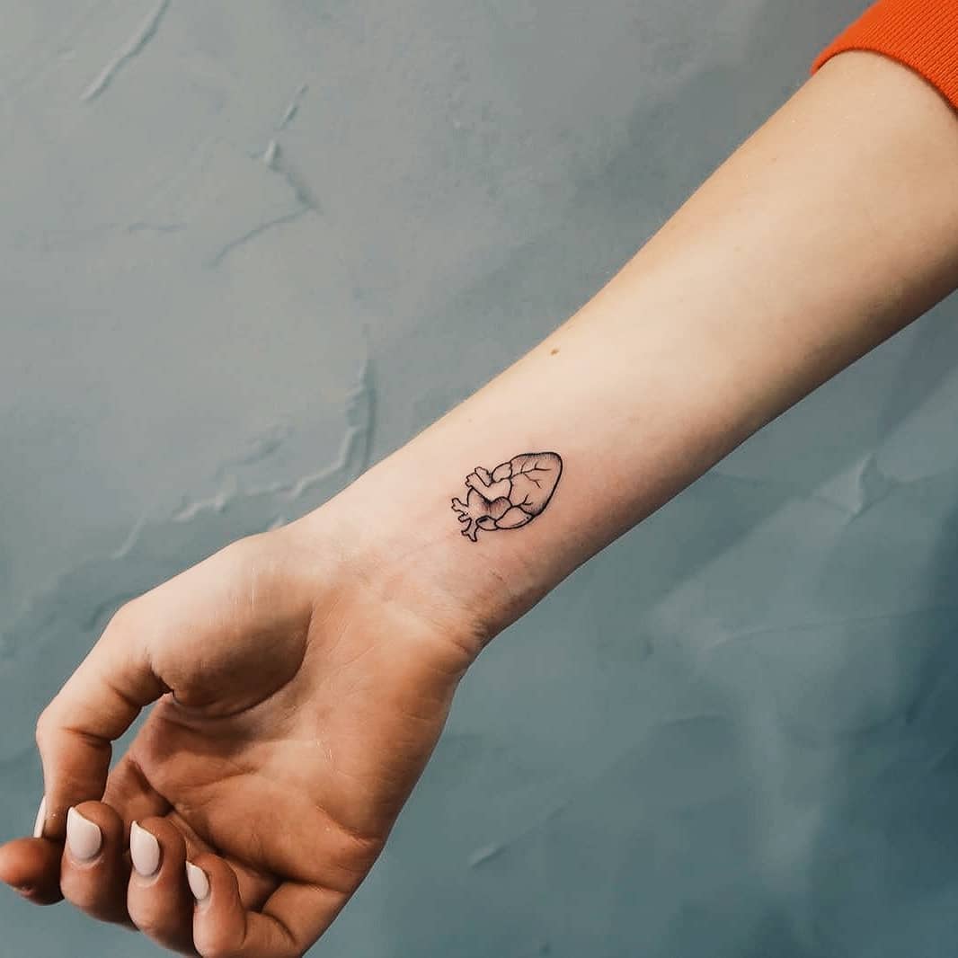 This wrist tattoo features a detailed sketch of a heart, capturing attention with its intricate lines and bold design. The simple yet powerful image speaks volumes, representing emotions or personal stories unique to the wearer. Wrist tattoos like this are perfect for those who want to keep their art both meaningful and discreet.