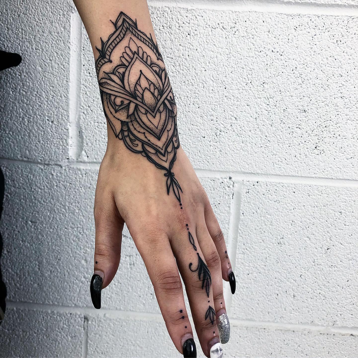 This stunning wrist tattoo features a beautifully detailed floral design that wraps elegantly around the wrist and extends onto the hand. The intricate lines and patterns create a mesmerizing effect, making it truly captivating to look at. For those considering a similar design, think about how it will complement your personal style and everyday look.