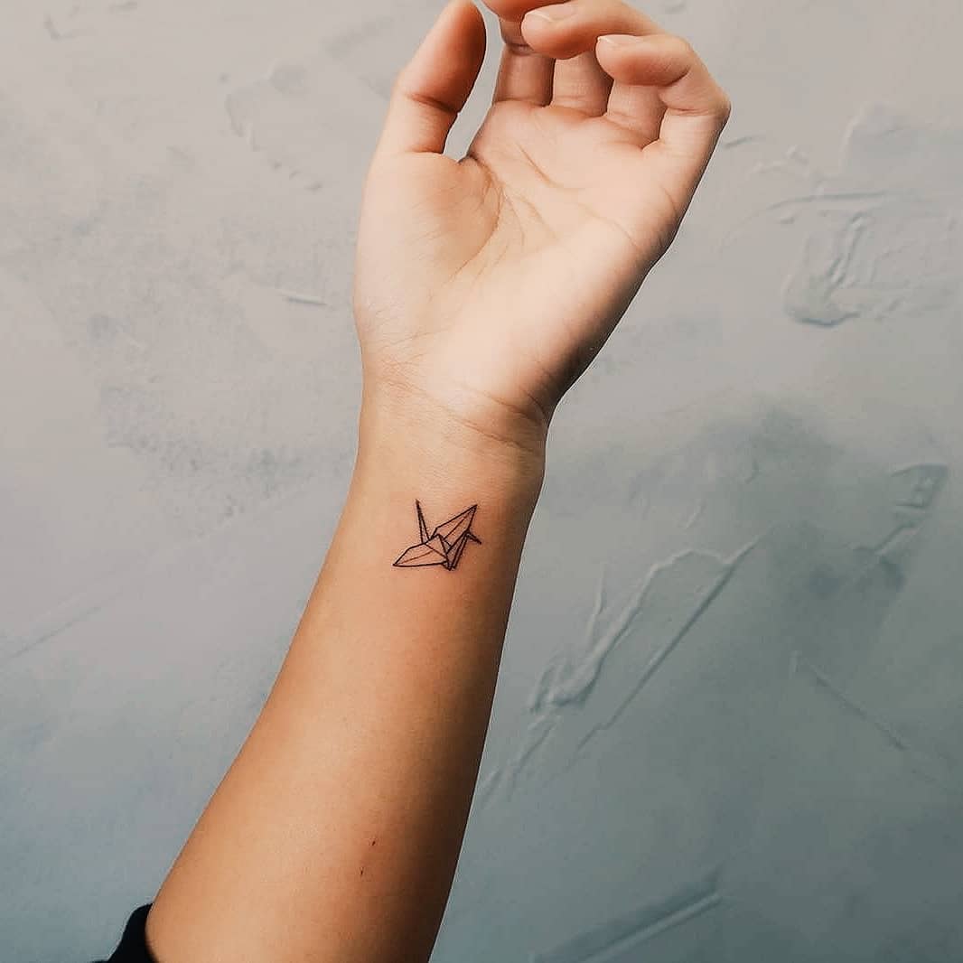 This wrist tattoo features a delicate origami crane, capturing a sense of peace and creativity. The simple lines and geometric shape make it a standout piece, offering a modern twist on a traditional symbol. Choosing a minimalistic design like this can keep a tattoo timeless and meaningful.