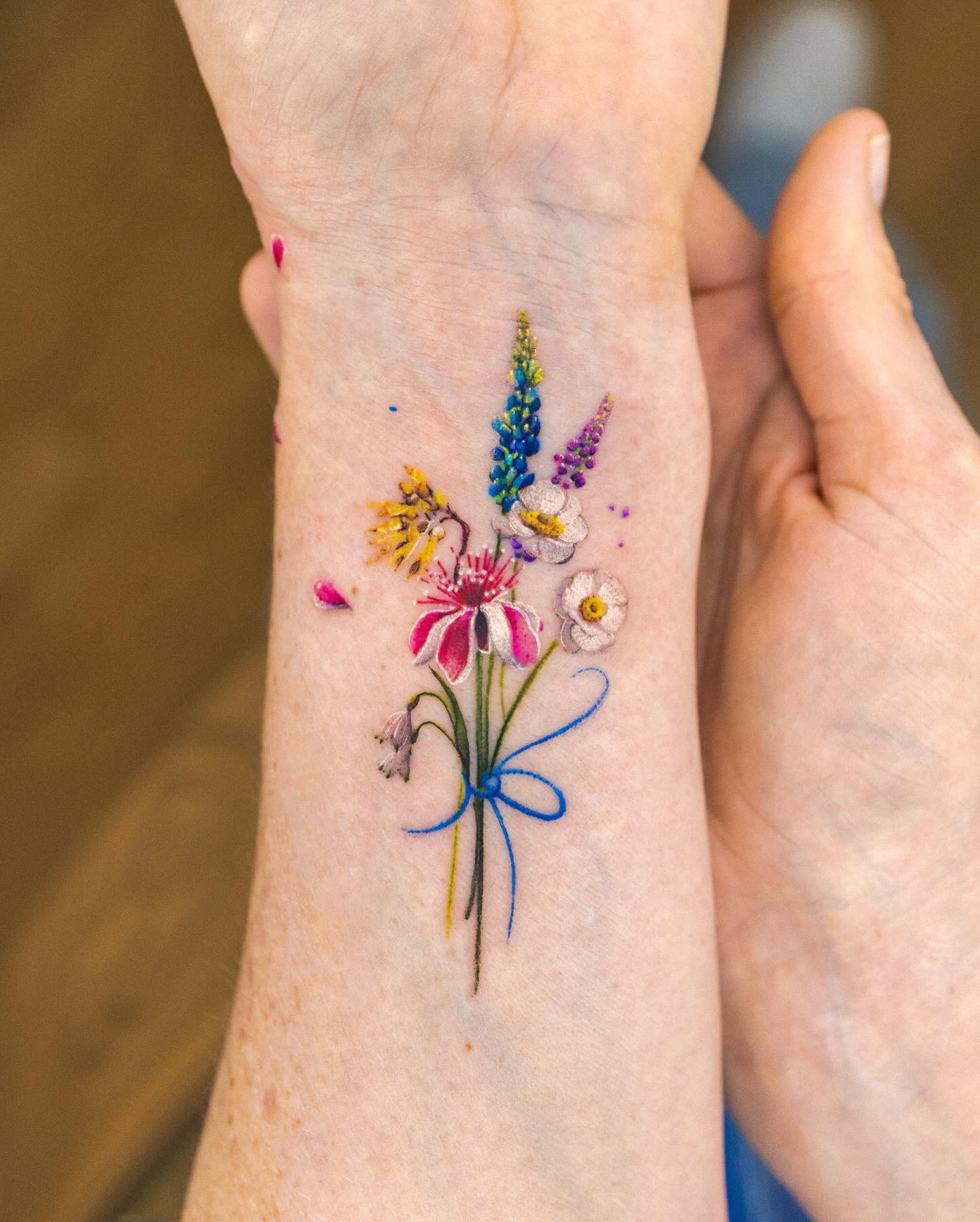 This wrist tattoo features a charming bouquet of colorful flowers tied together with a delicate blue ribbon. Each bloom bursts with vibrant hues, creating a lively and cheerful design. Perfect for nature lovers, this tattoo can be a daily reminder of beauty and growth.