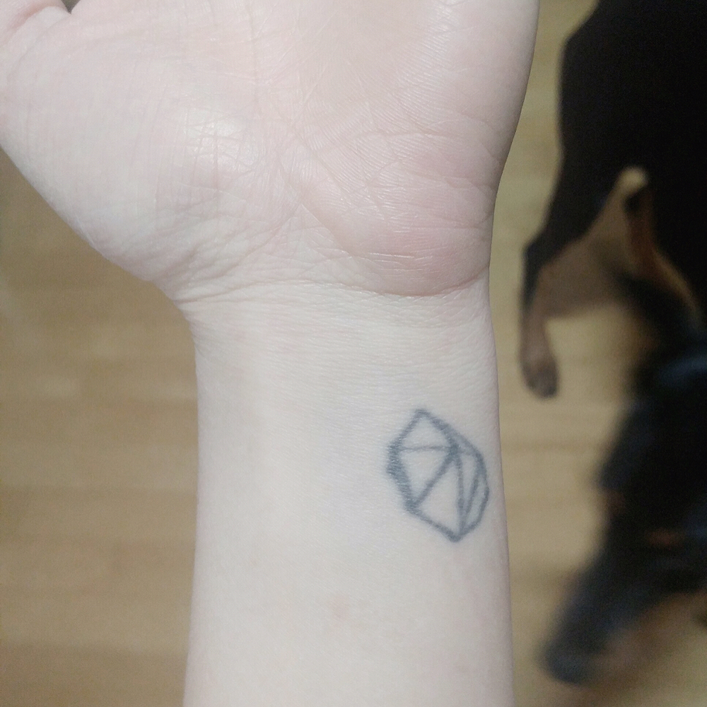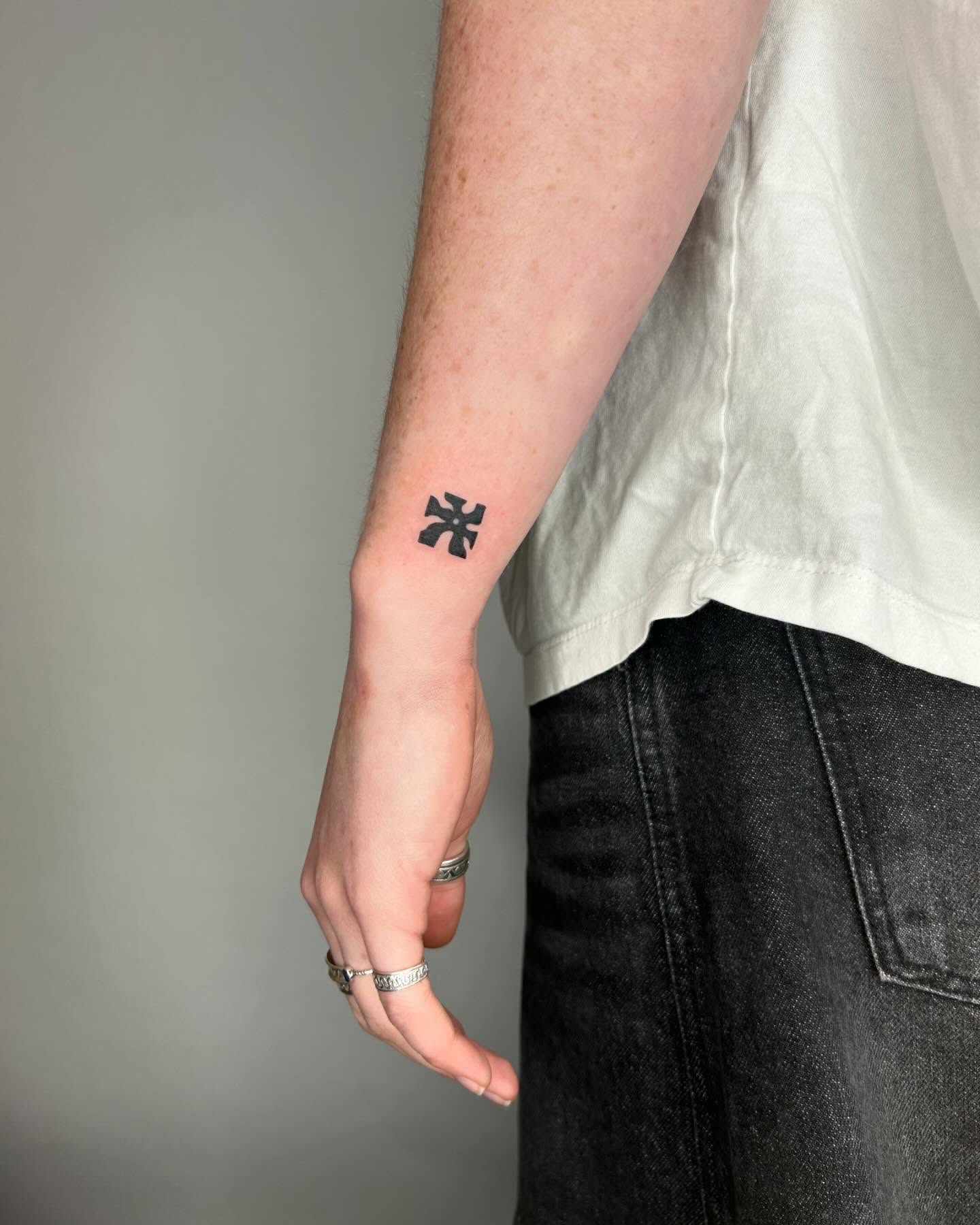 This image showcases a simple yet mesmerizing geometric tattoo on the wrist. The clean lines and unique shape create a modern look that draws the eye. A wrist tattoo like this is perfect for those who appreciate minimalistic art with a personal touch.