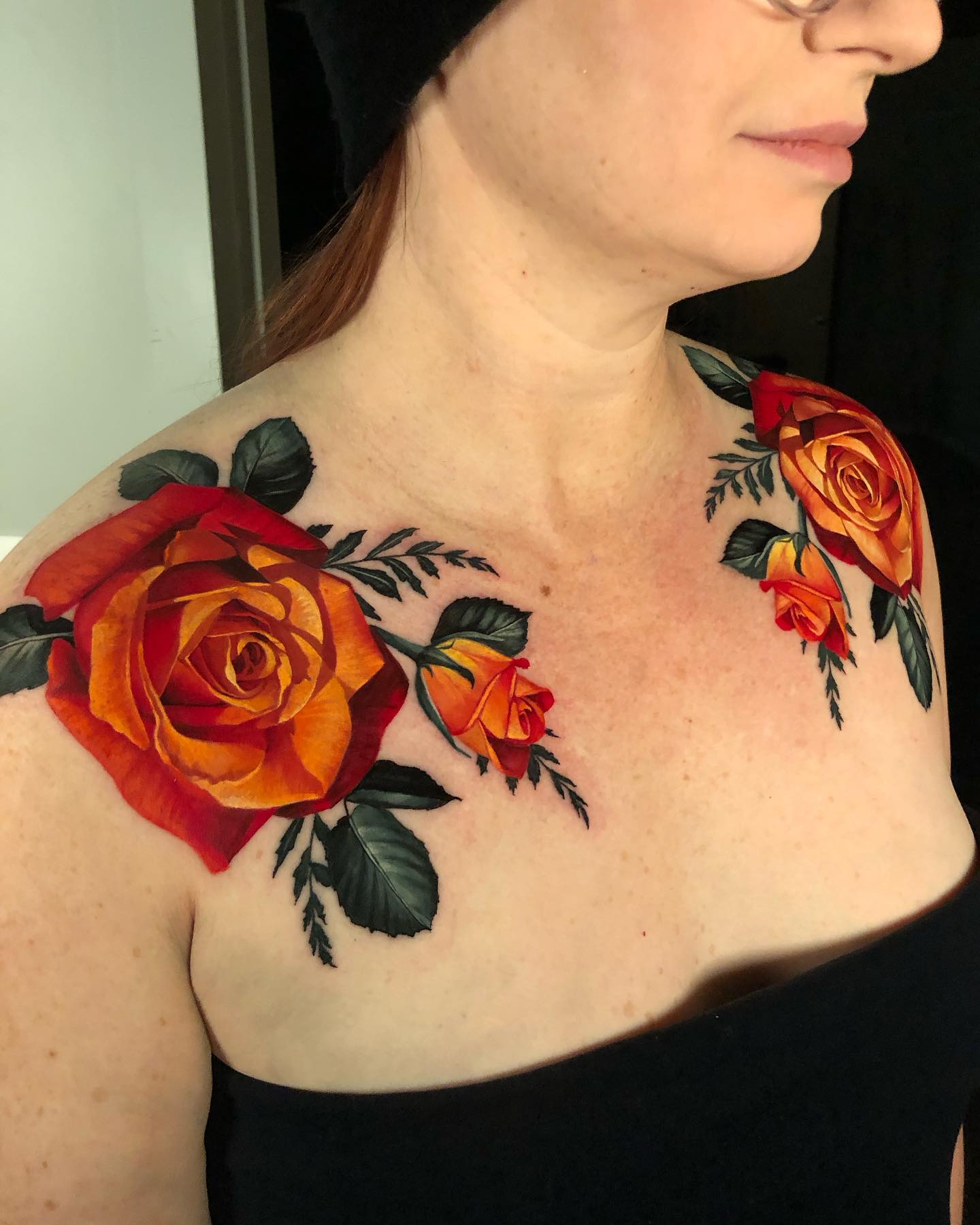 The tattoo showcases large, vibrant roses in shades of red and orange, beautifully complemented by dark green leaves.