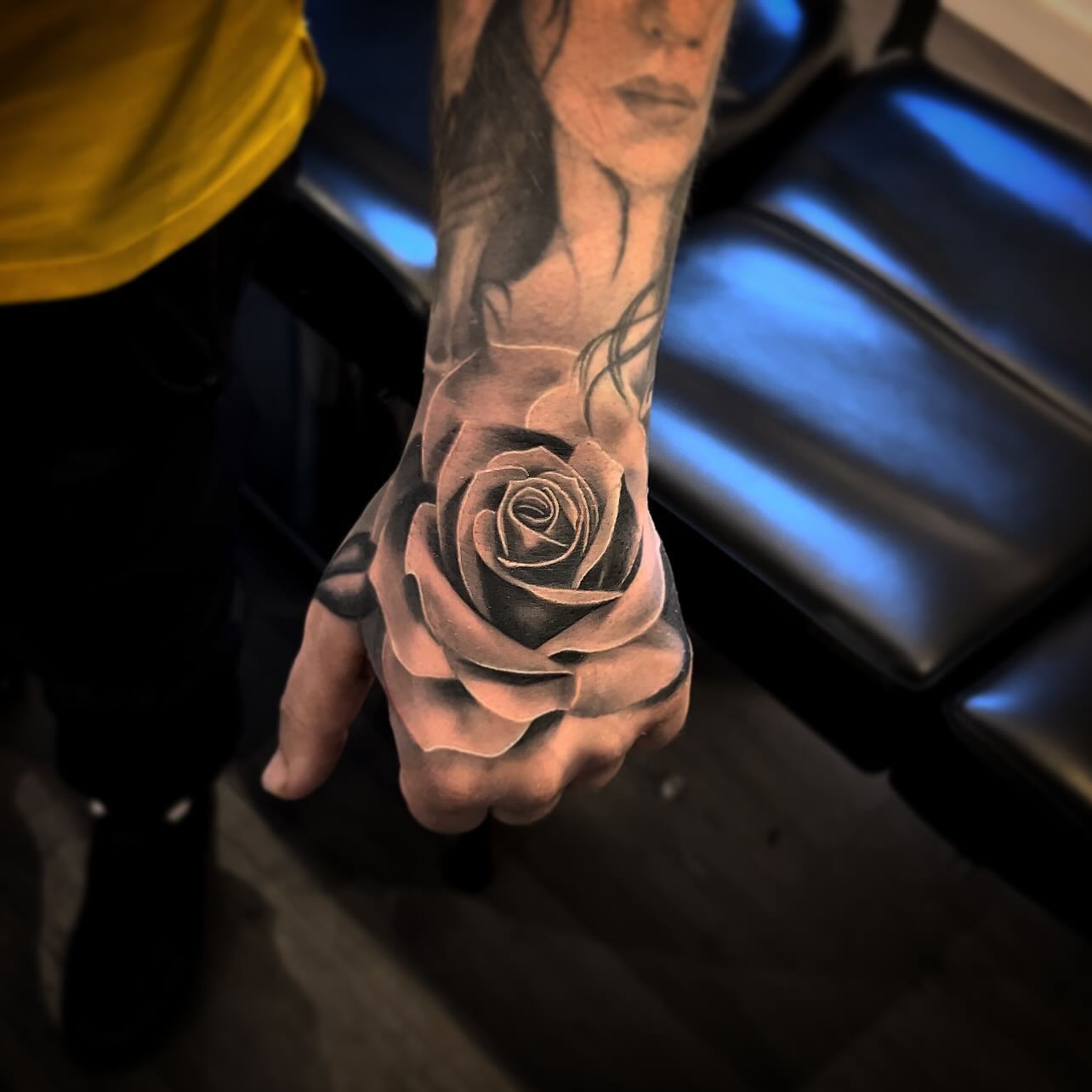 The prominent black rose tattoo on the hand showcases intricate shading and depth, making the flower appear almost three-dimensional.