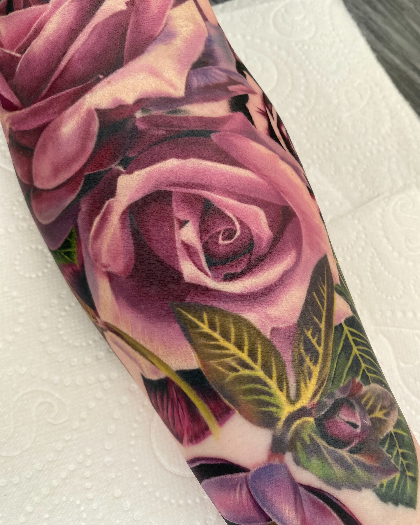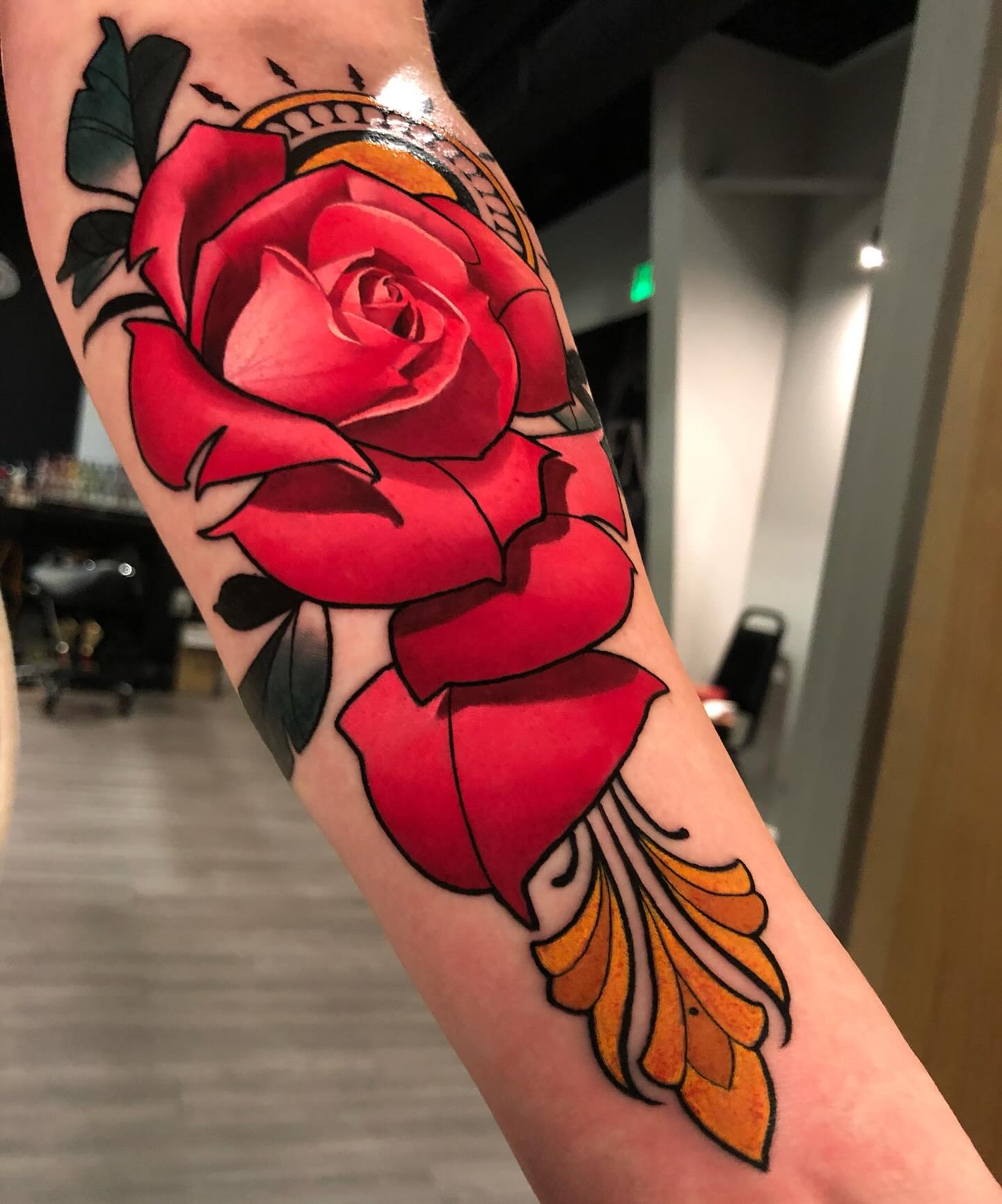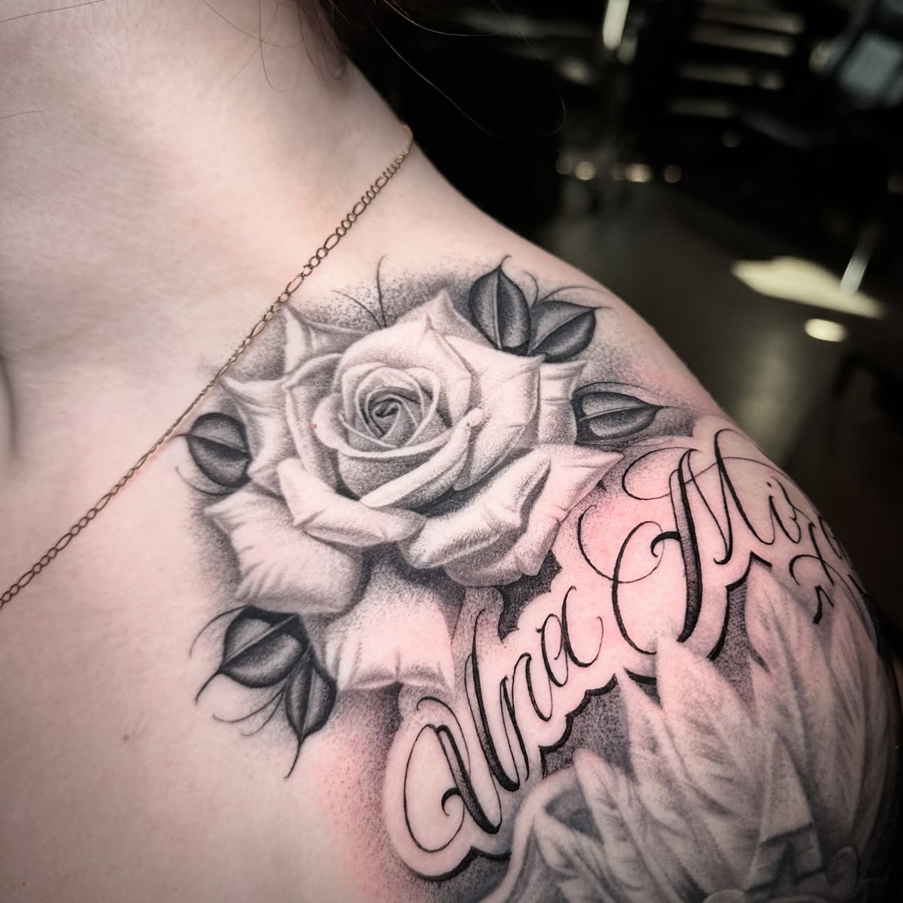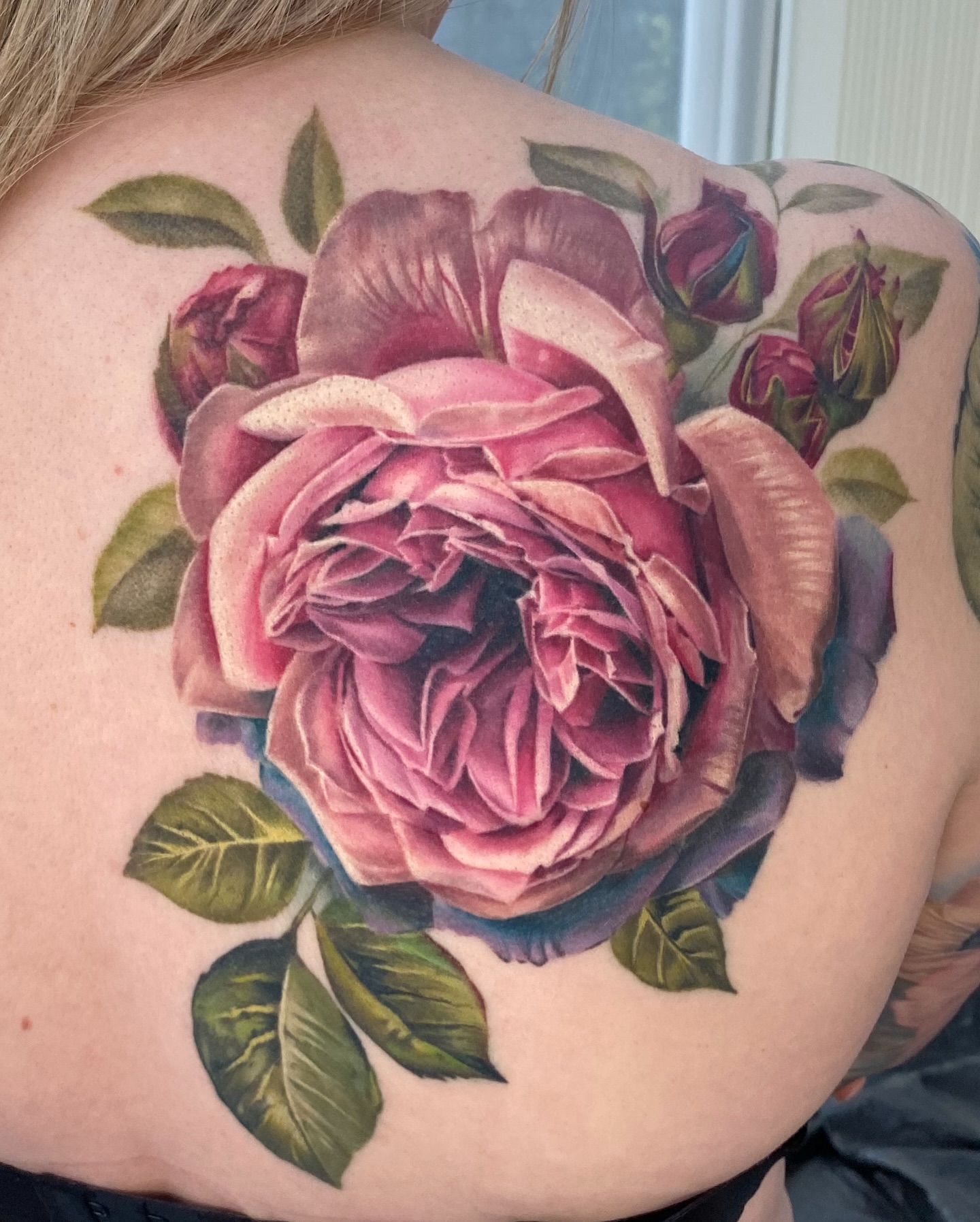 The intricate details of the rose tattoo showcase delicate petals and realistic shading.