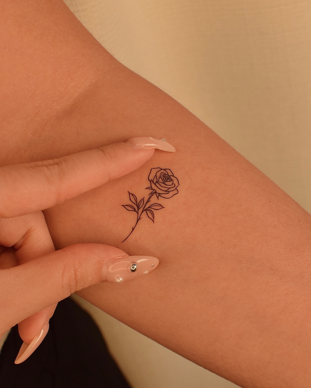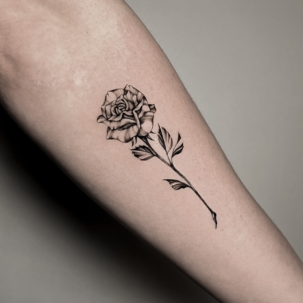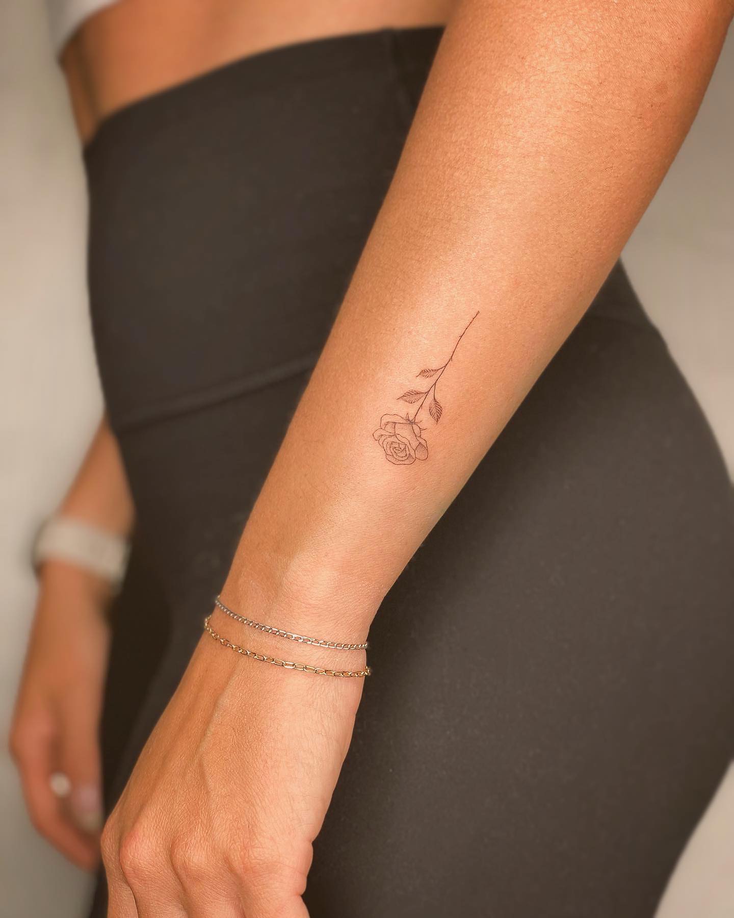 A delicate rose tattoo graces the forearm, featuring fine lines and subtle shading that highlight its elegant shape.