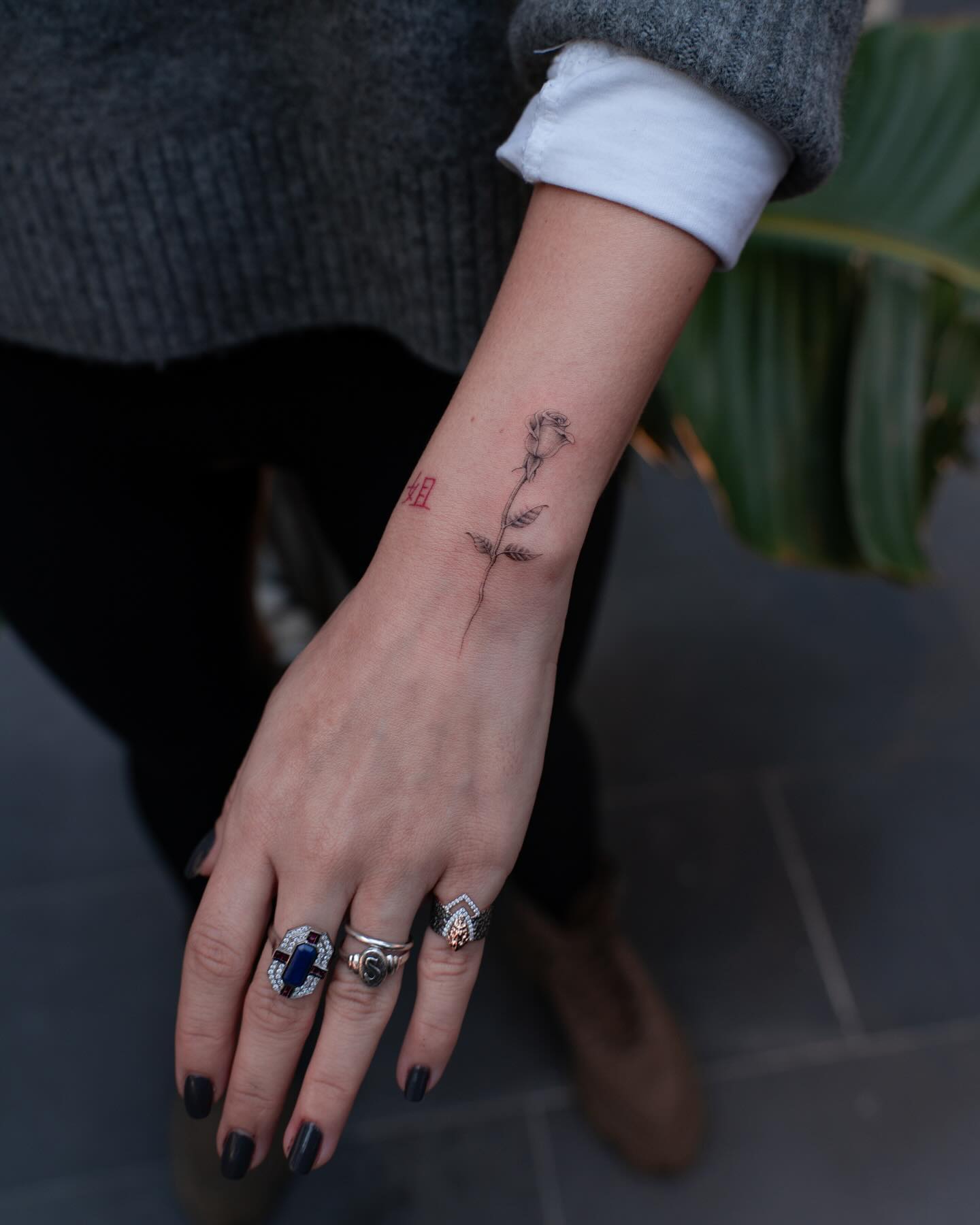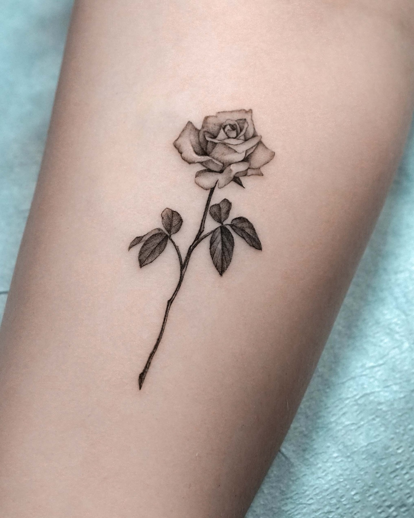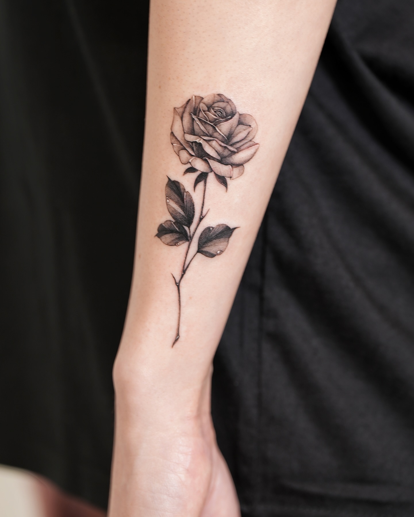 A delicate rose tattoo graces the forearm, featuring fine lines and subtle shading that highlight its elegant shape.