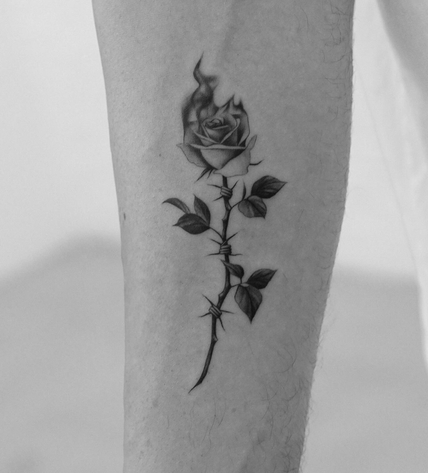 The tattoo features a detailed black and gray rose with a striking flame at the top.