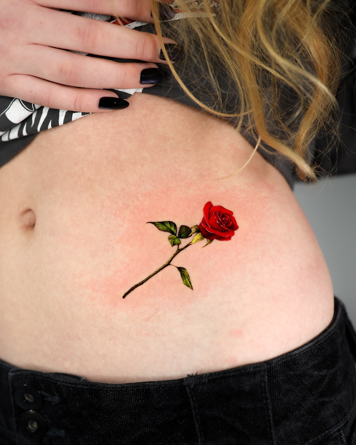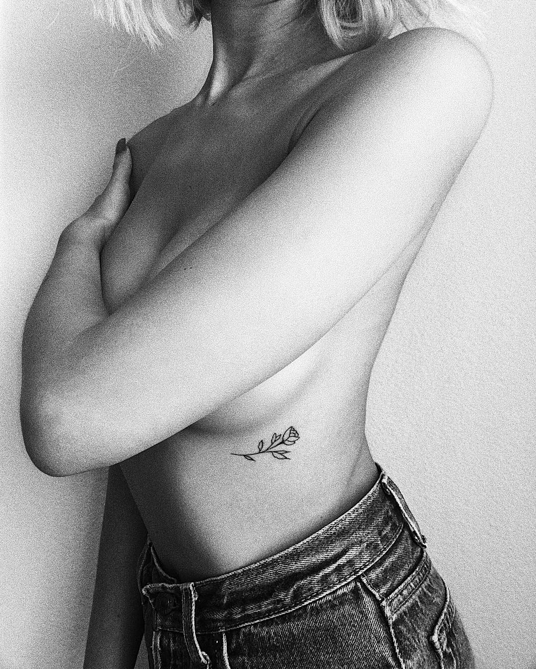 A simple rose tattoo is elegantly placed on the side of the torso, showcasing the beauty of minimalist art.