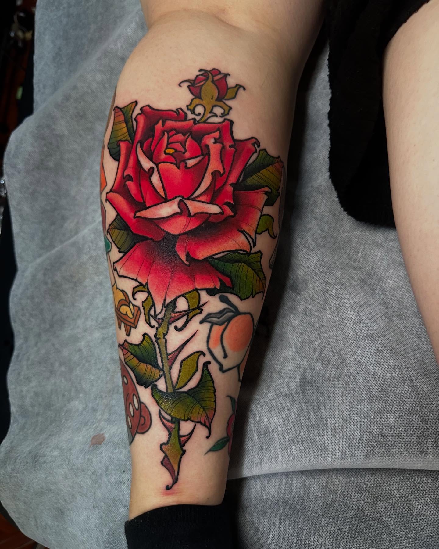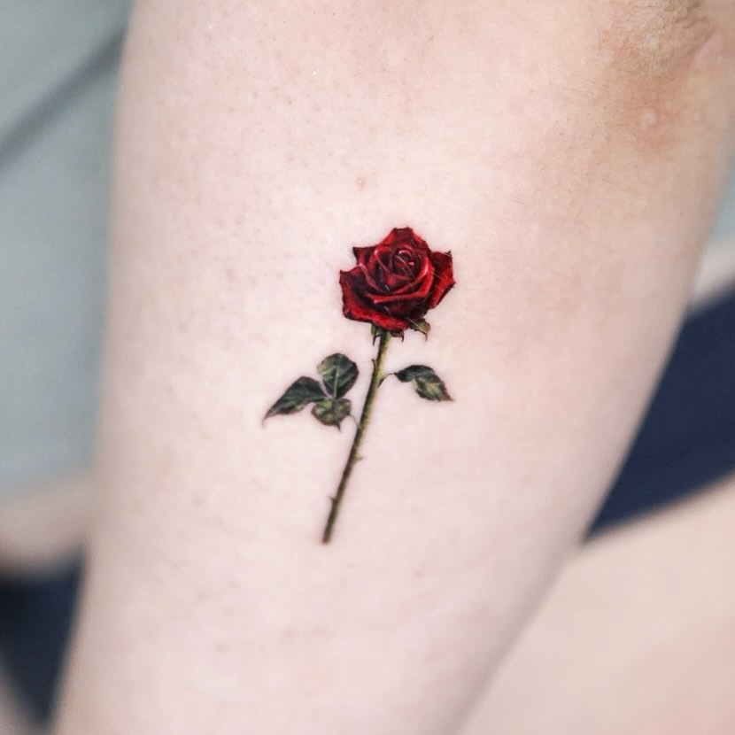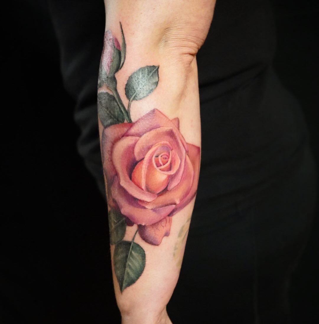 The vibrant rose tattoo features intricate details and soft colors that mimic the natural beauty of a blooming flower.