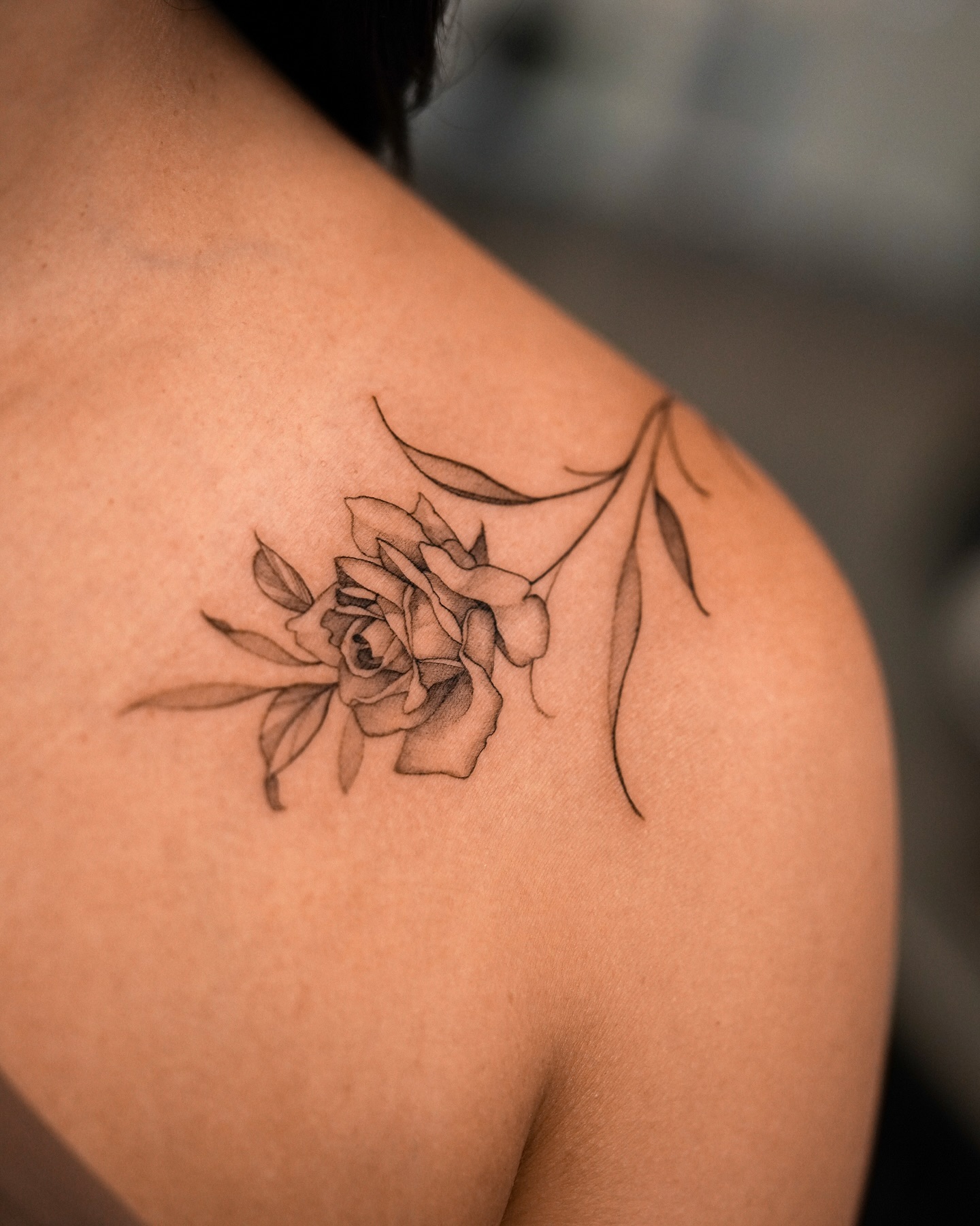 The intricate design features a detailed rose, complemented by graceful leaves that extend elegantly along the shoulder.
