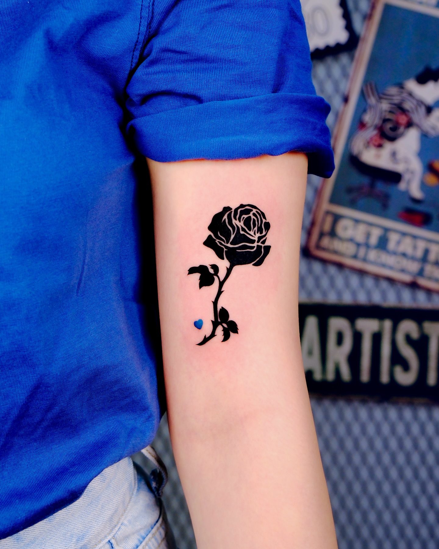 The tattoo features a striking black rose with a delicate blue heart near the base of the stem.
