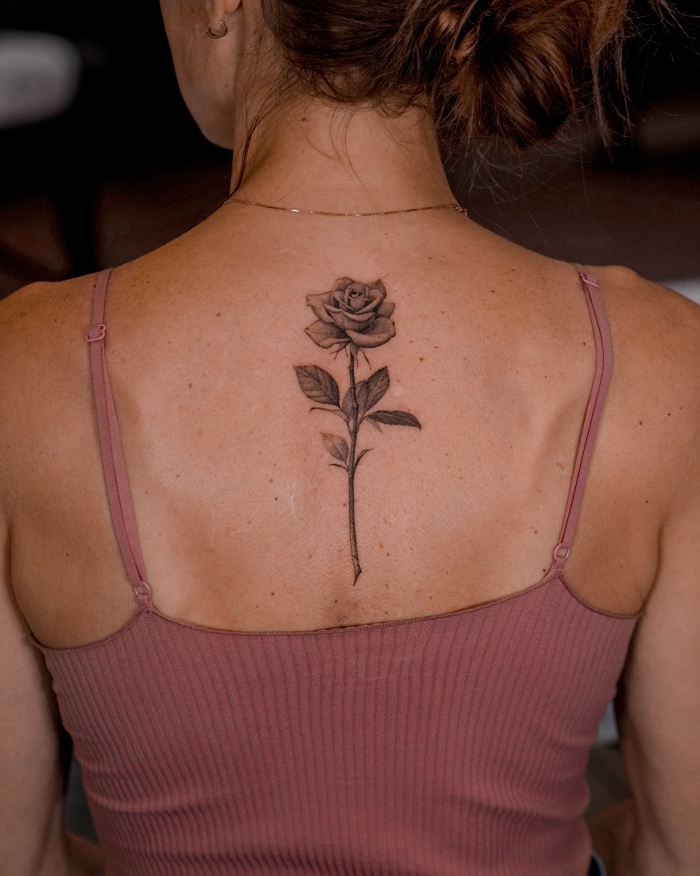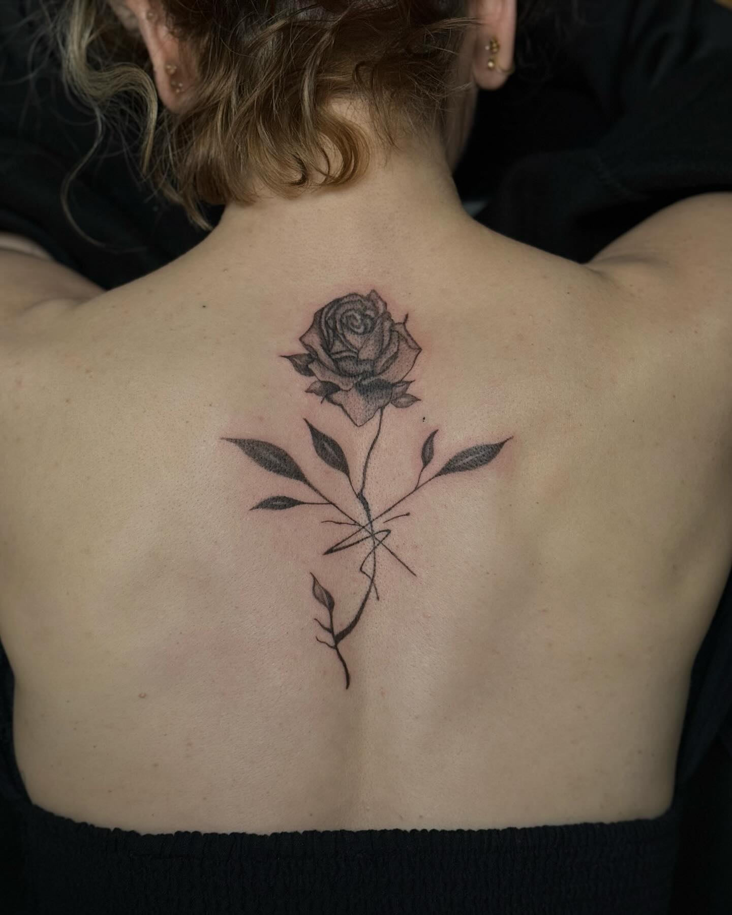 The rose tattoo showcases a detailed black and gray design, emphasizing the flower’s intricate petals and leaves.