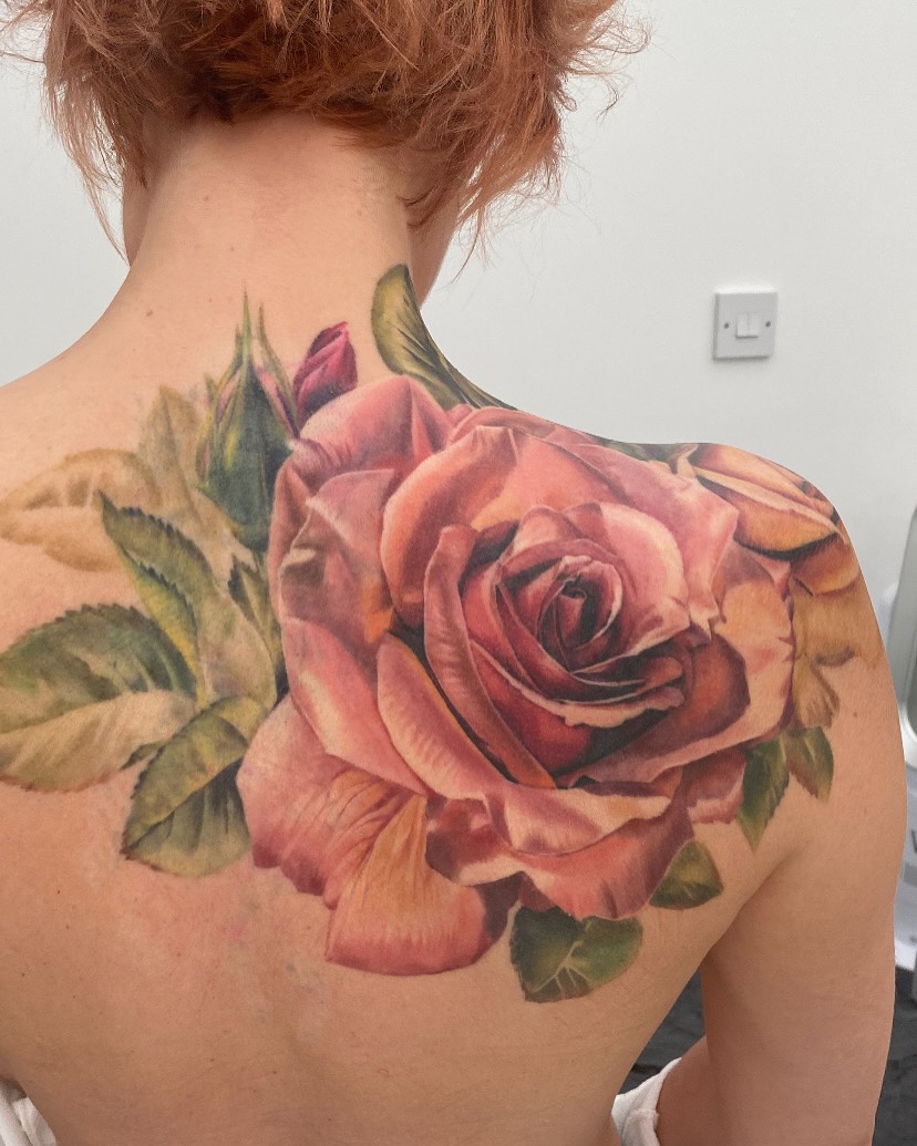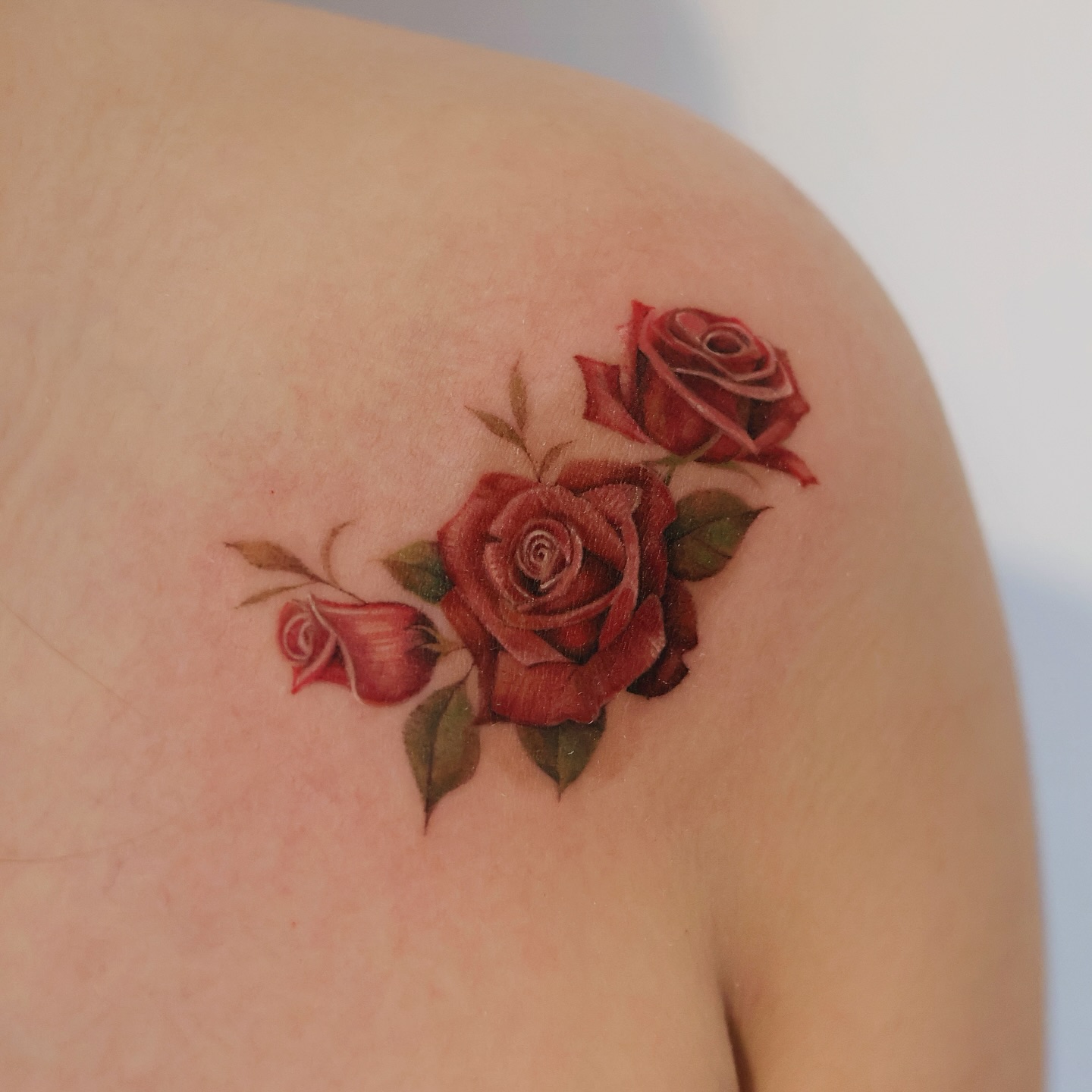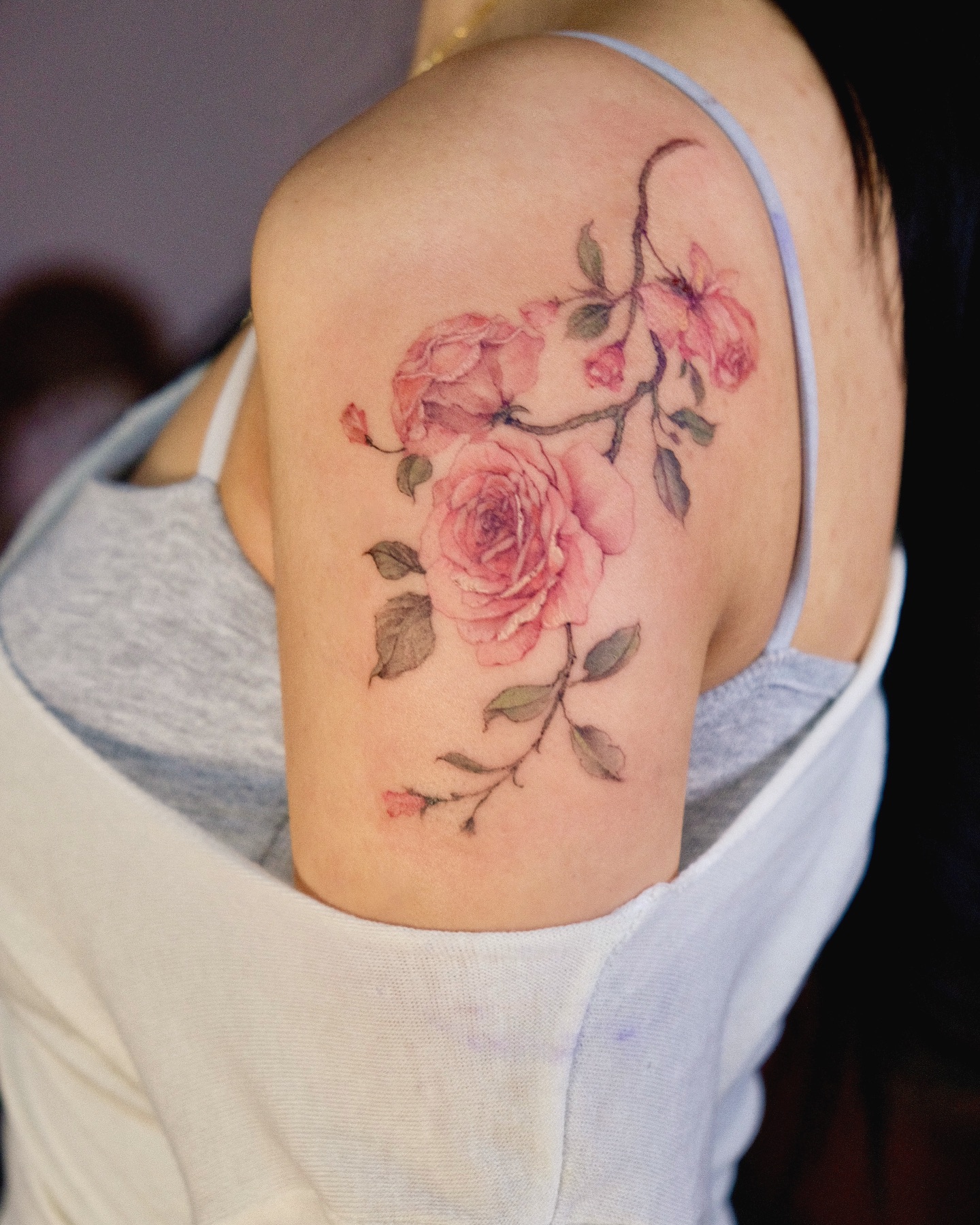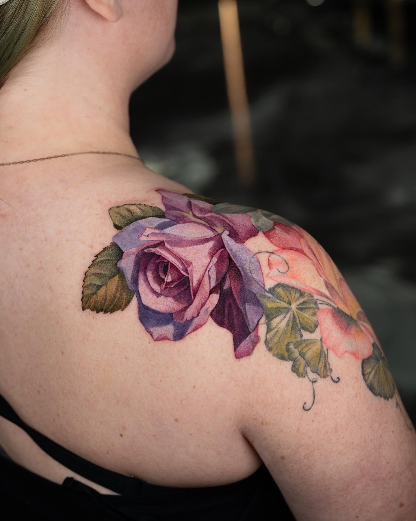 The tattoo showcases a beautifully detailed arrangement of roses and leaves that flow gracefully over the shoulder.
