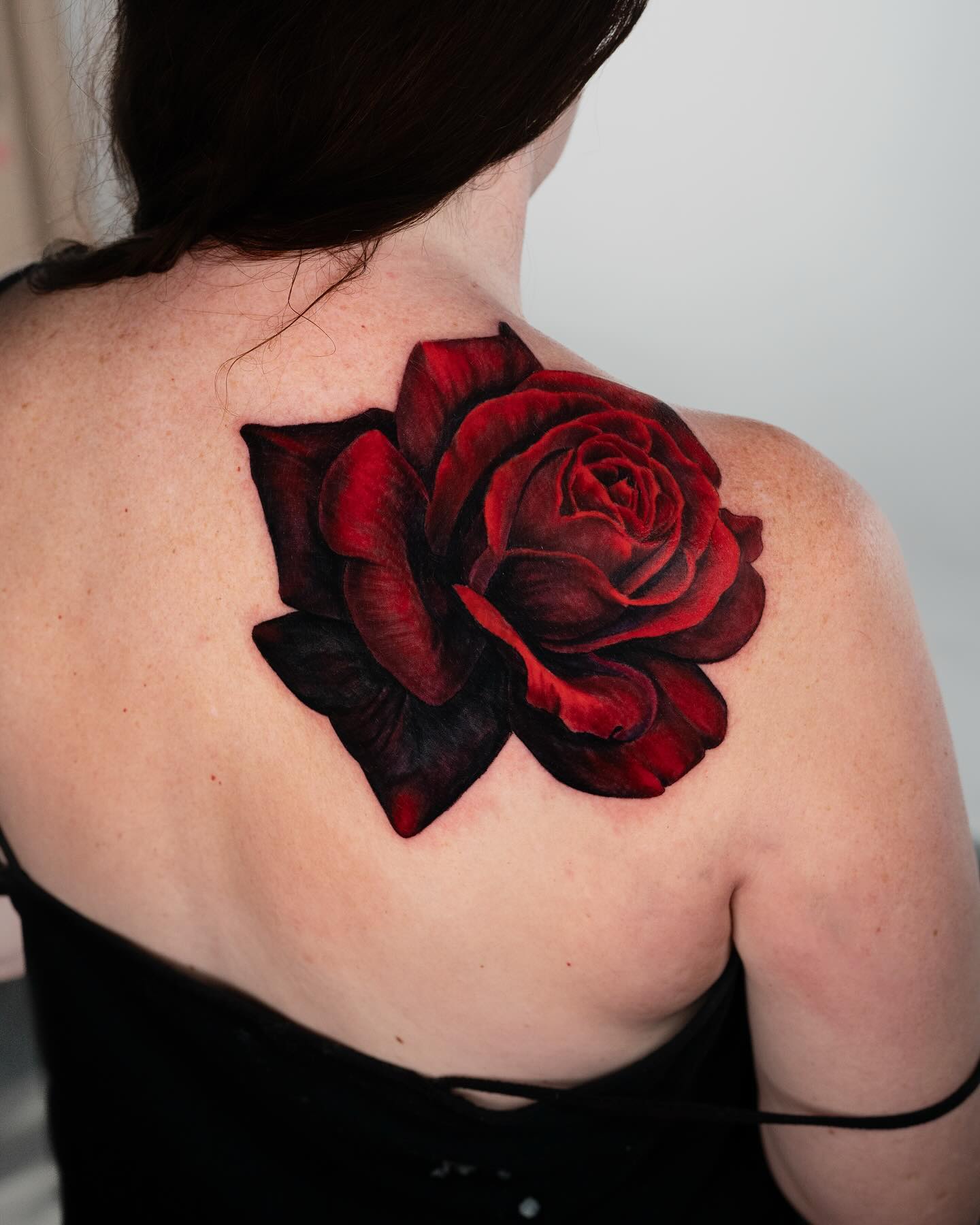 The striking deep red rose tattoo showcases intricate shading that brings the flower to life on the skin.