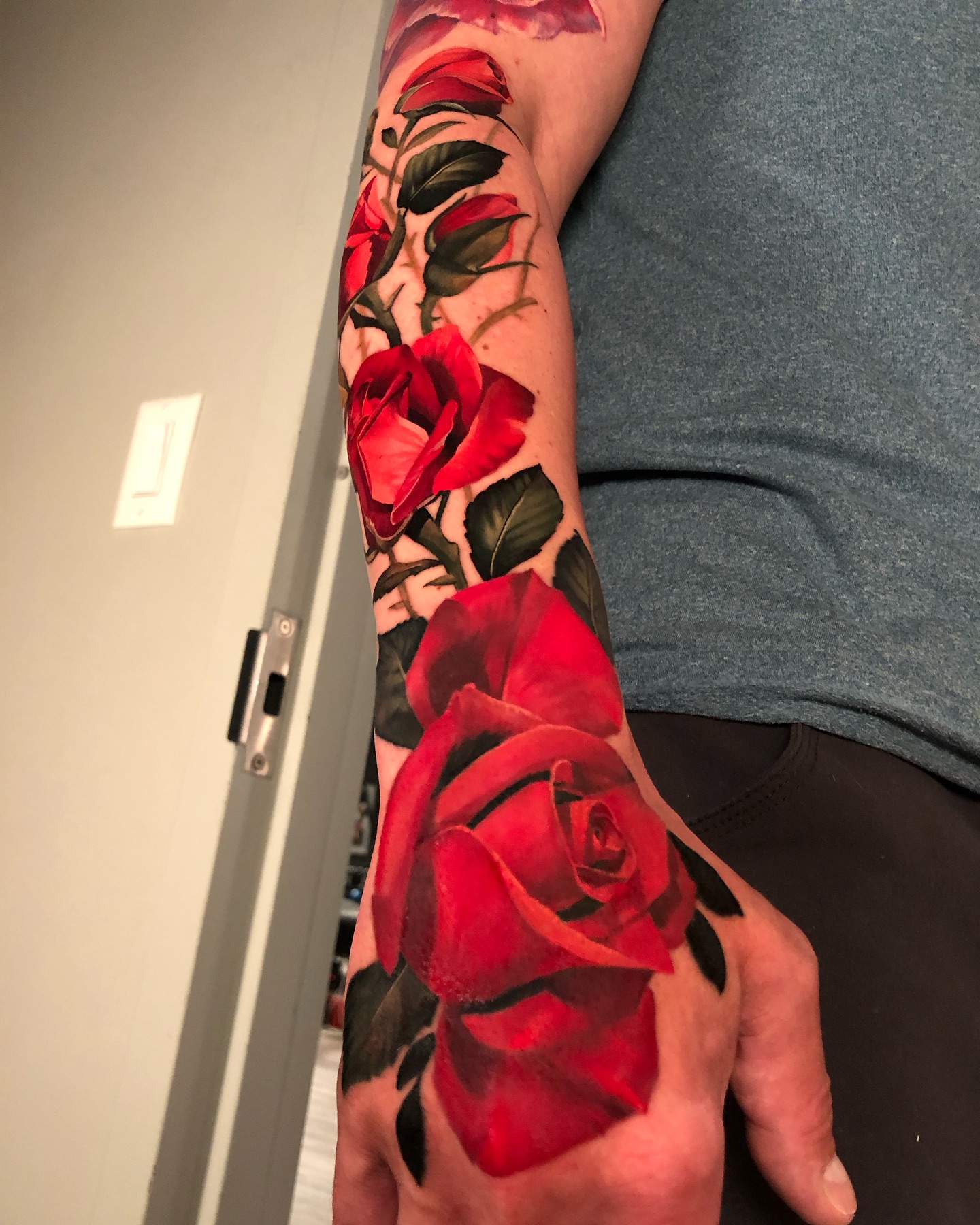 The tattoo features large, detailed red roses that are rich in color and realism.