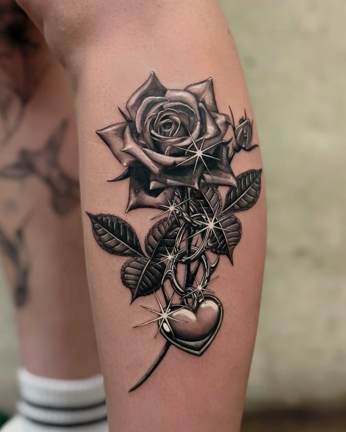 The intricate black and gray rose tattoo stands out prominently against the skin, showcasing detailed petals and leaves.