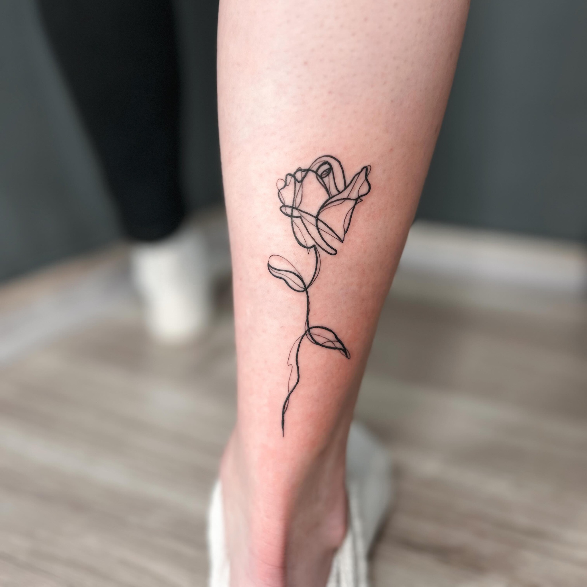 The tattoo features a simple yet elegant line drawing of a rose that stands out with its fluid, continuous strokes.