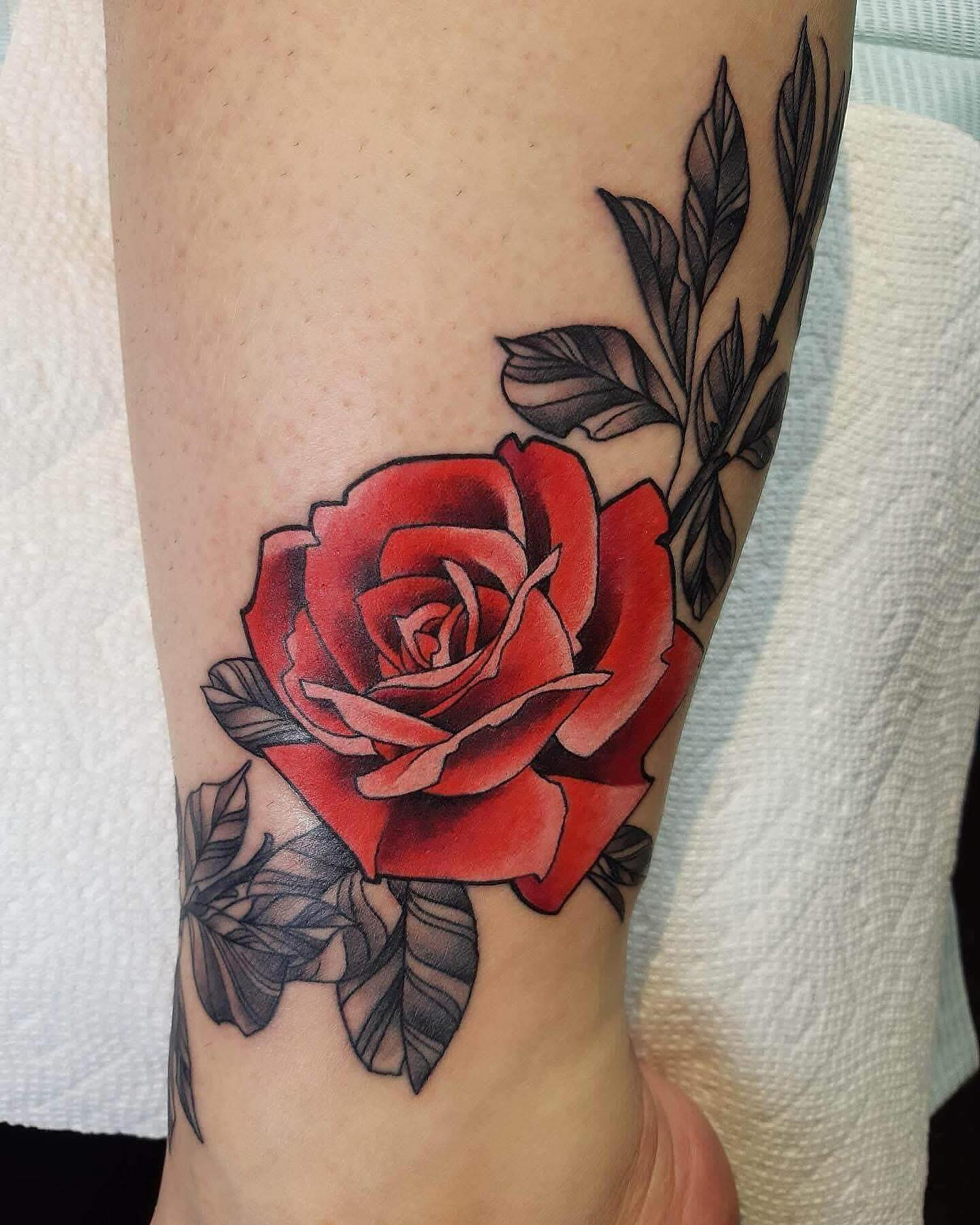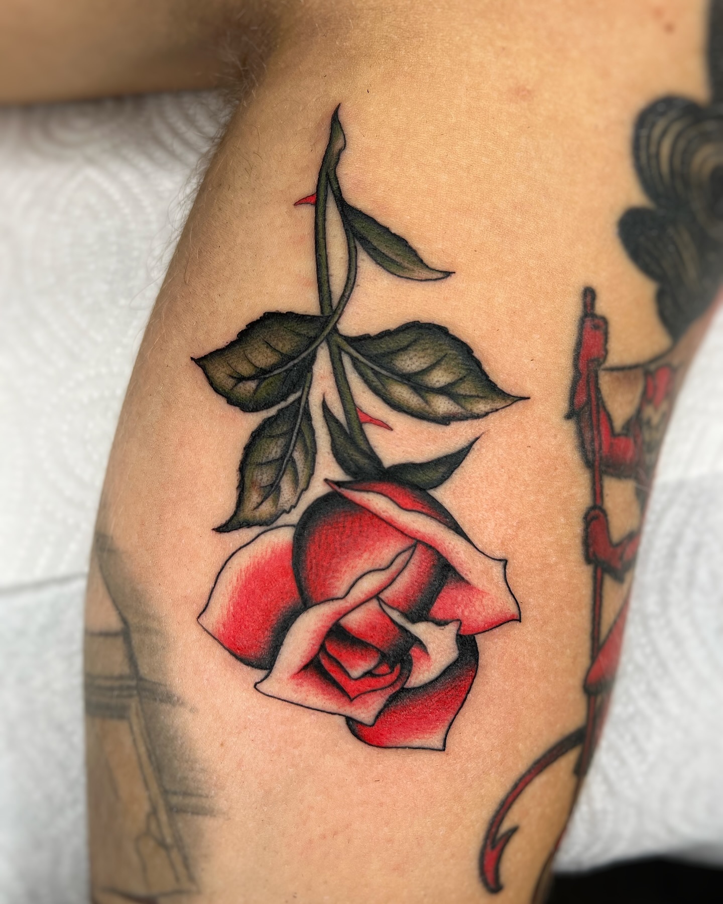 The tattoo showcases a bold red rose that stands out with its rich color and intricate shading.