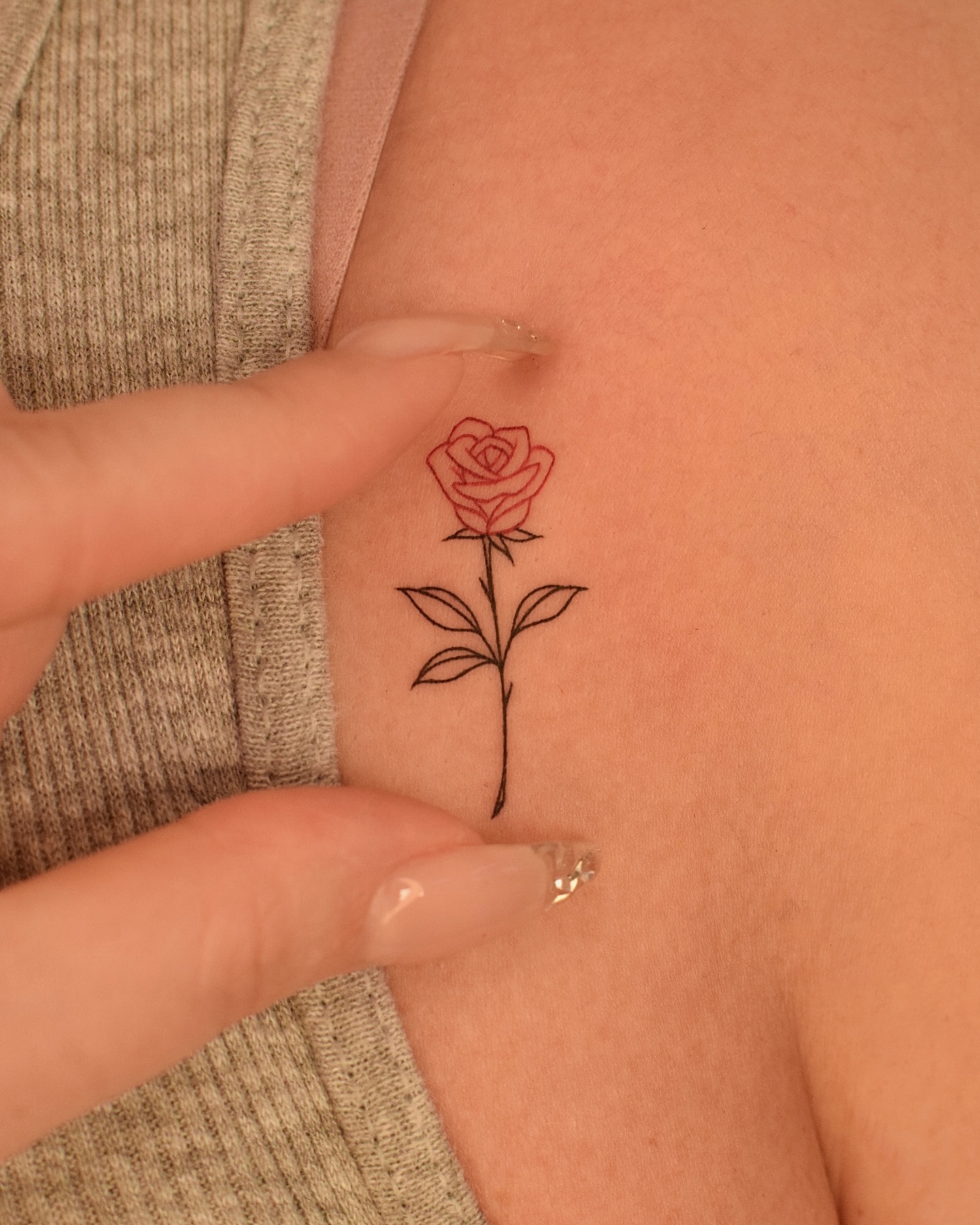 A small rose tattoo featuring soft red petals and clean black outlines stands out on the skin.