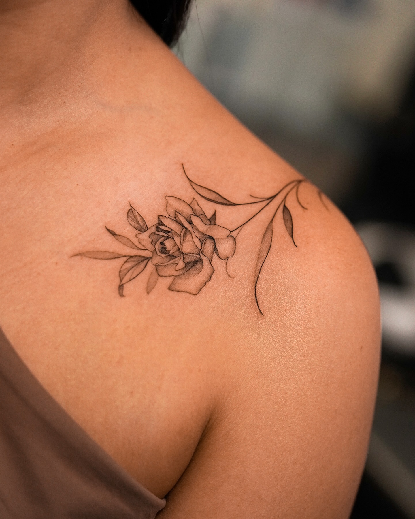 The tattoo features a finely detailed rose that curves gracefully along the shoulder.