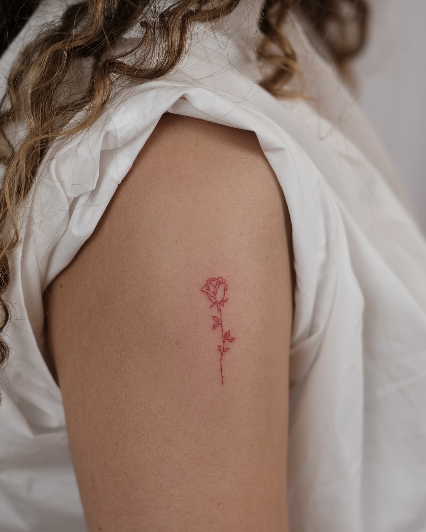 A slender red rose tattoo gracefully adorns the upper arm, showcasing fine lines and subtle details.