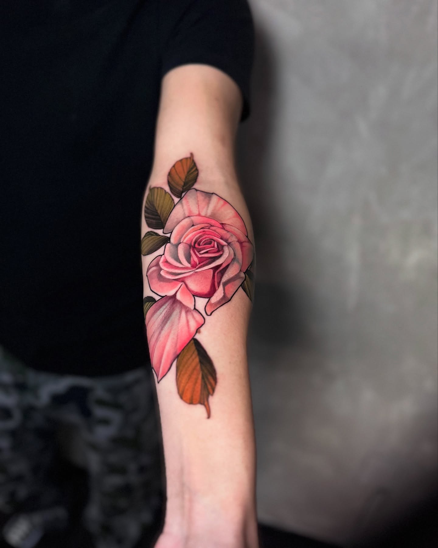 The tattoo features a realistic depiction of a rose in soft pink hues, complemented by dark green leaves.