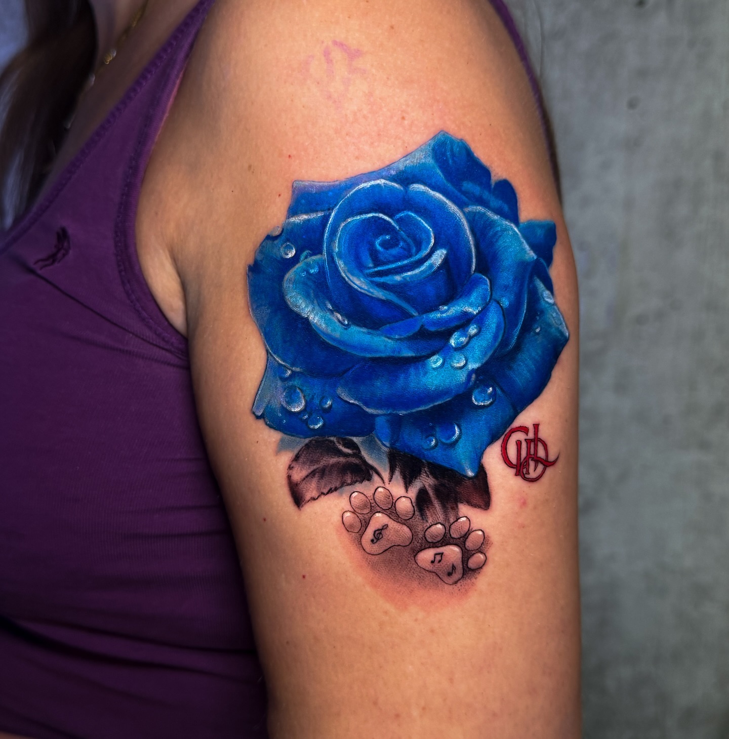 The tattoo features a striking blue rose adorned with water droplets, creating a lively and fresh appearance.