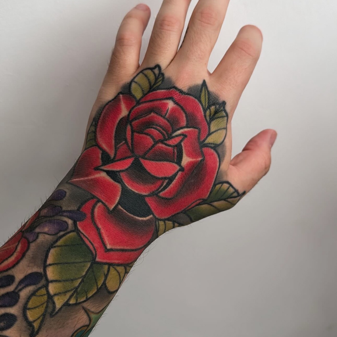 The vibrant red rose tattoo prominently displayed on the hand captures attention with its detailed petals and lush green leaves.