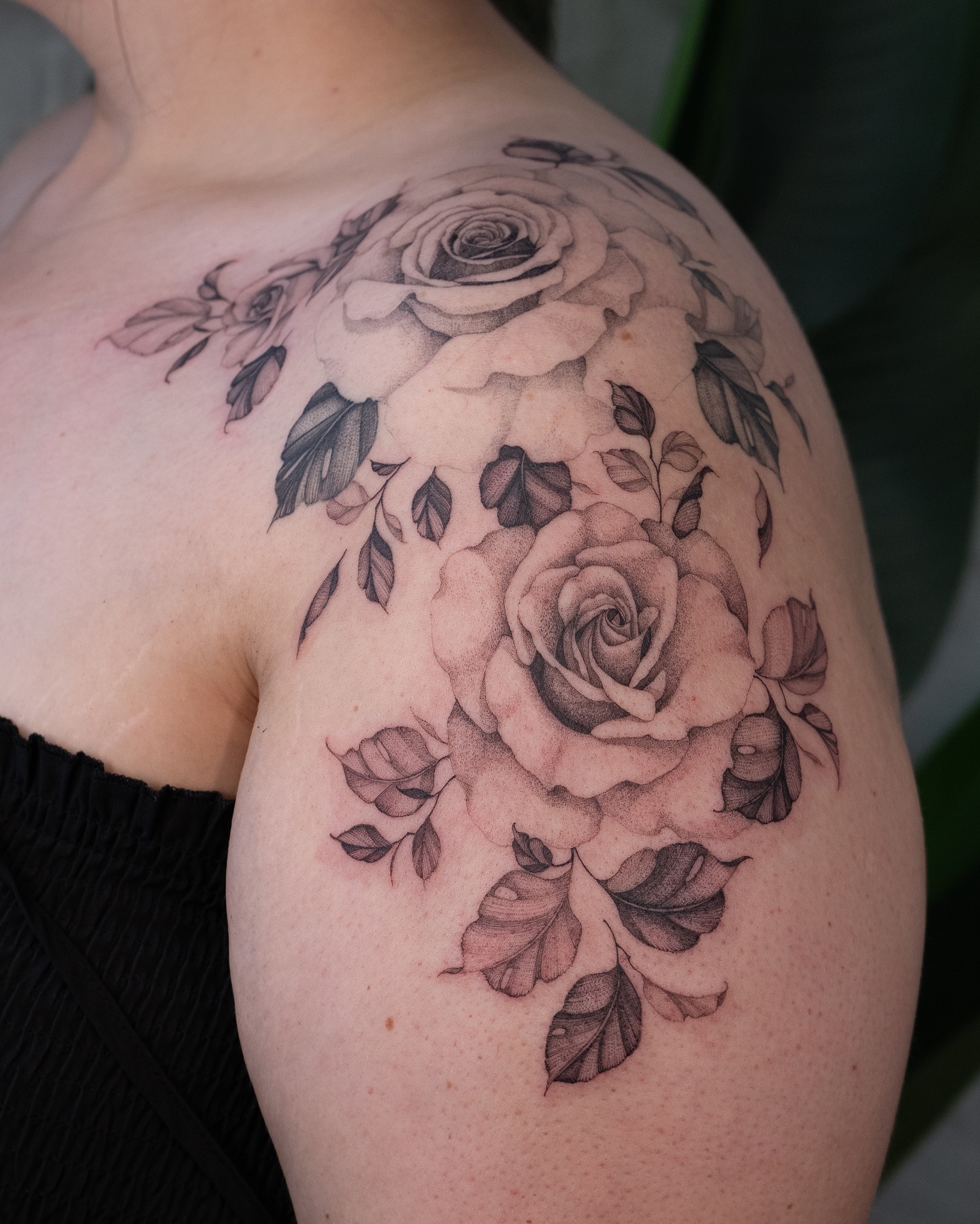 The tattoo features intricately shaded roses surrounded by delicate leaves on a shoulder.