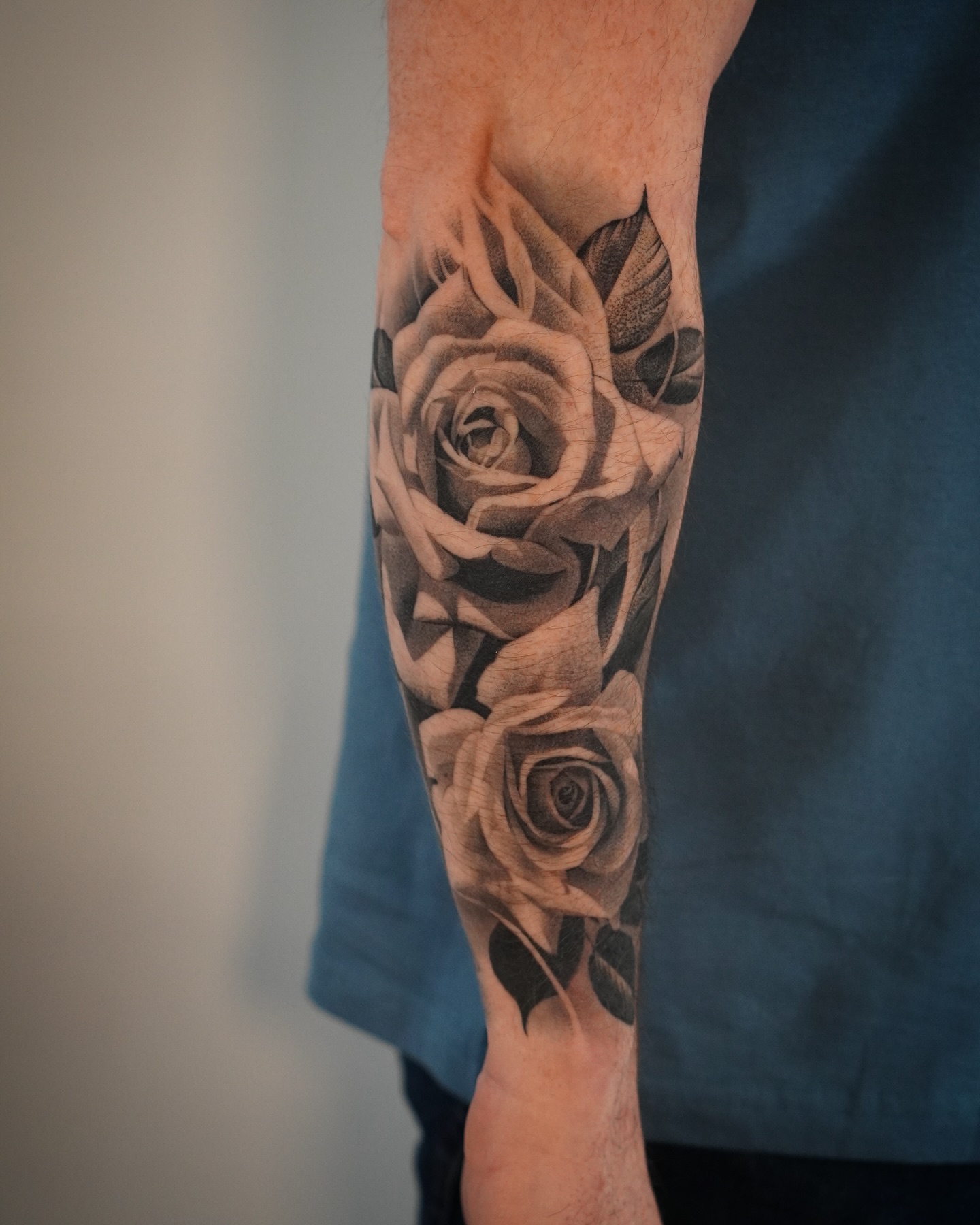 The tattoo features intricately shaded black and gray roses that flow gracefully along the forearm.