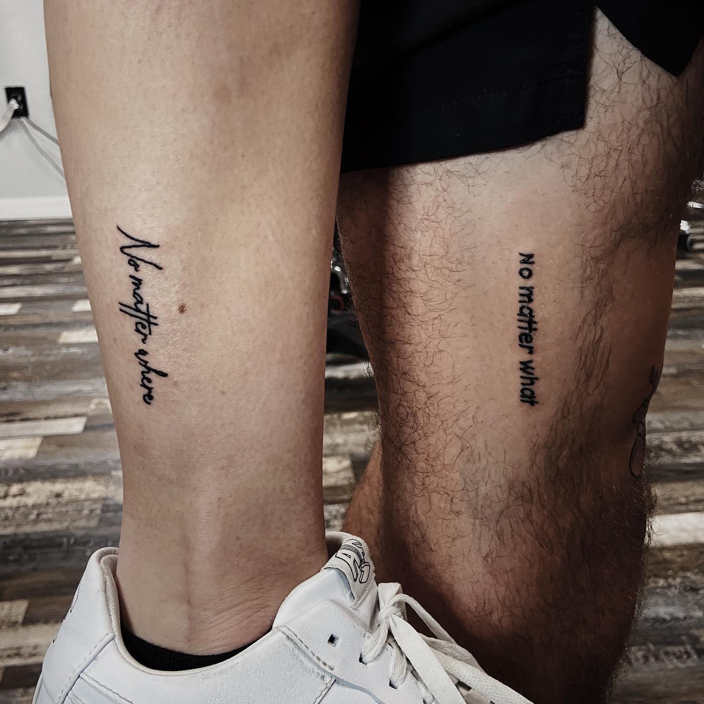 This image showcases two tattoos that beautifully express an unbreakable sibling connection. The phrases “No matter where” and “No matter what” serve as powerful reminders of loyalty and support, tying the brother and sister together no matter the distance or circumstances. A great tip for anyone considering matching tattoos is to choose words or symbols that hold personal significance for both siblings.