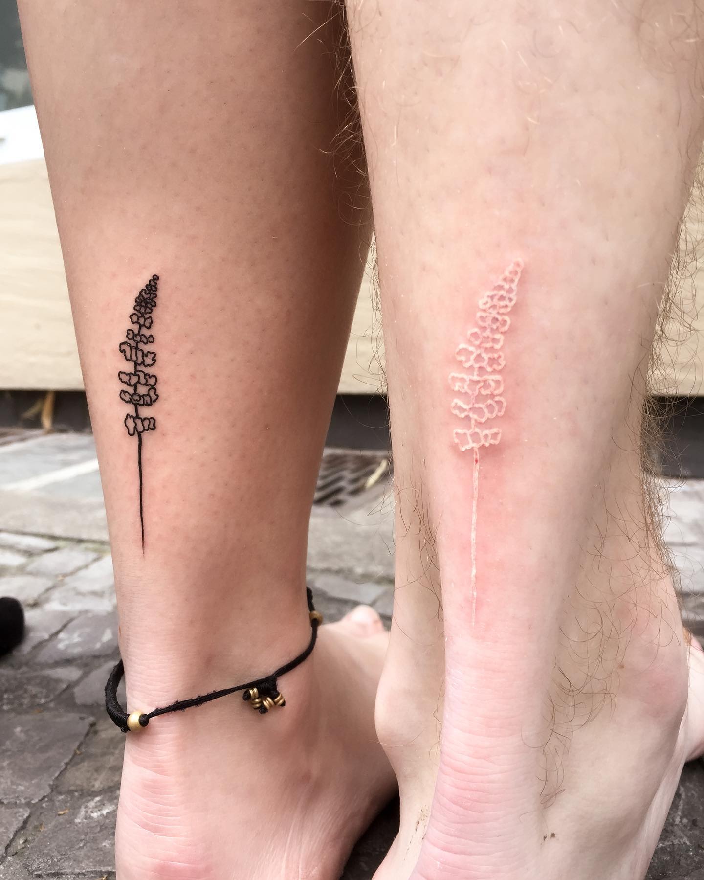 This image showcases two beautifully designed tattoos of a fern, one in bold black and the other in a delicate pink. The contrast creates a stunning visual story, symbolizing the unique bond between siblings. Sharing matching tattoos can be a fun way to celebrate that connection, reminding them of their shared memories and experiences.