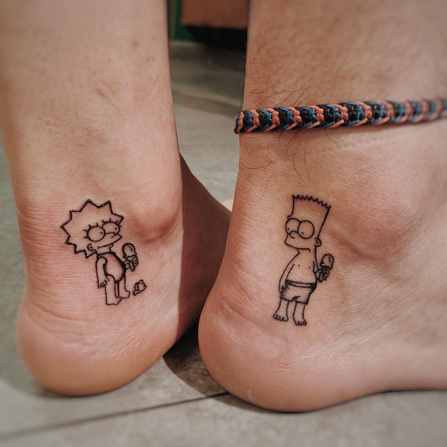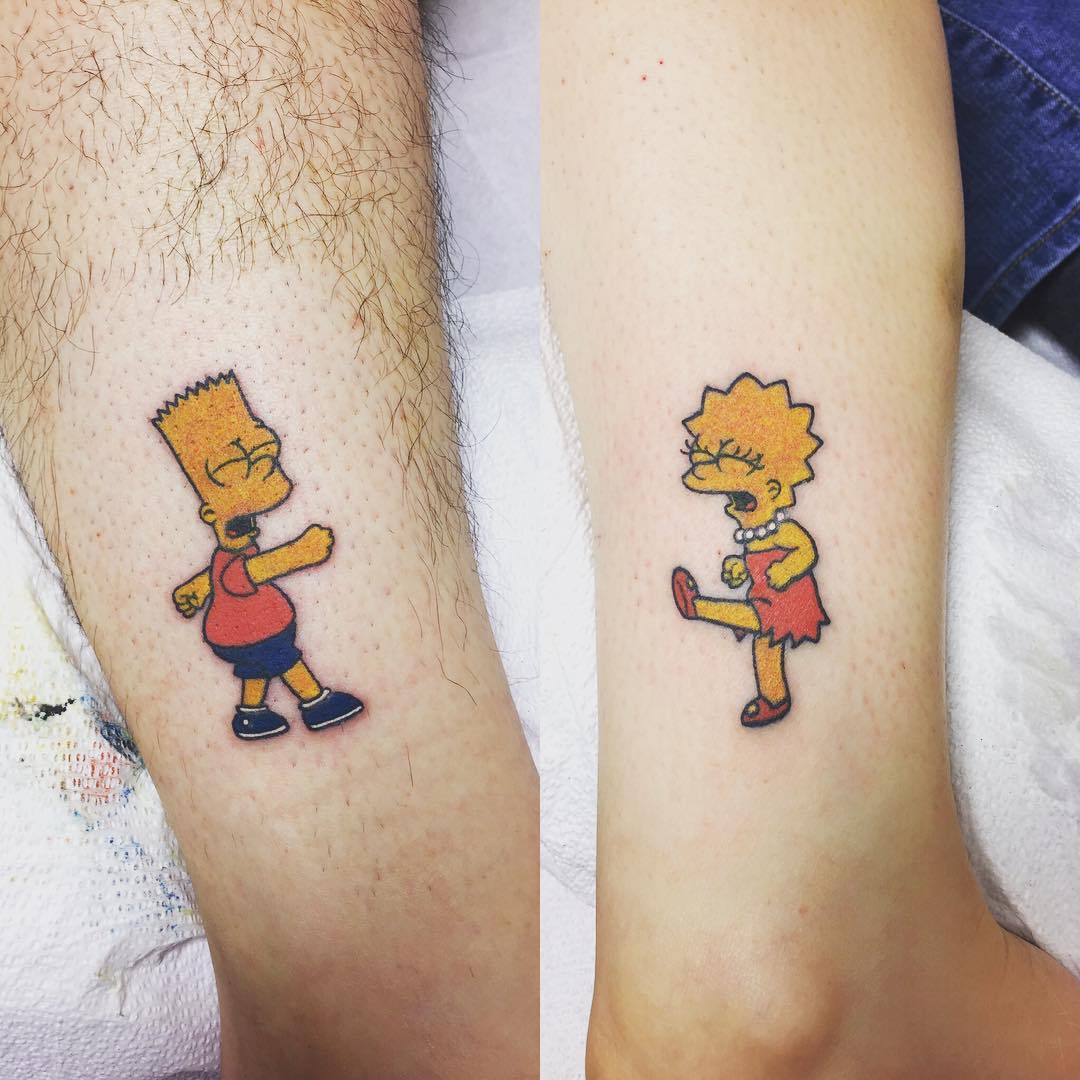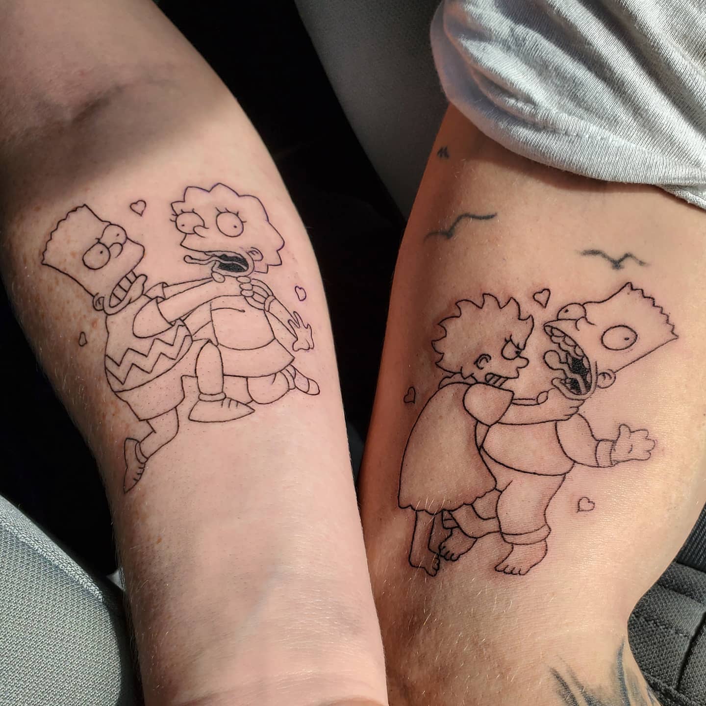 This image showcases two playful tattoos of iconic cartoon characters, Bart and Lisa Simpson, capturing the essence of sibling relationships. The bright colors and lively expressions evoke nostalgia and remind viewers of the fun moments shared between brothers and sisters. For those considering sibling-themed tattoos, choosing characters that represent your bond can make the designs even more meaningful.