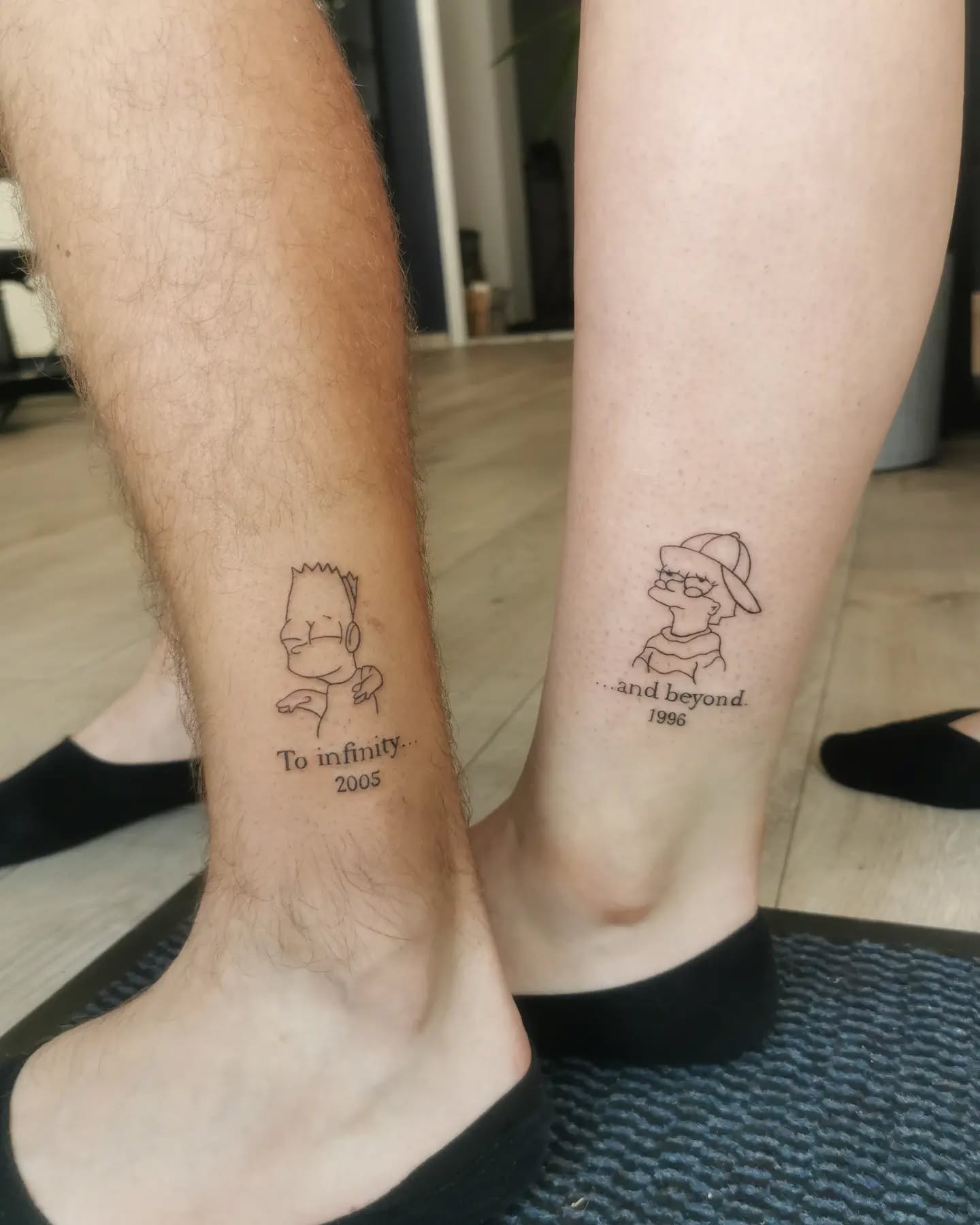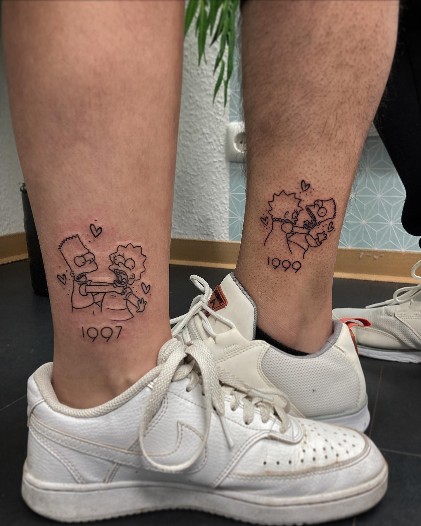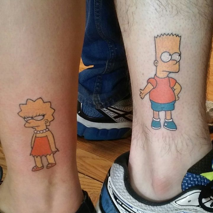 This image showcases two playful tattoos of iconic cartoon characters, Bart and Lisa Simpson, capturing the essence of sibling relationships. The bright colors and lively expressions evoke nostalgia and remind viewers of the fun moments shared between brothers and sisters. For those considering sibling-themed tattoos, choosing characters that represent your bond can make the designs even more meaningful.