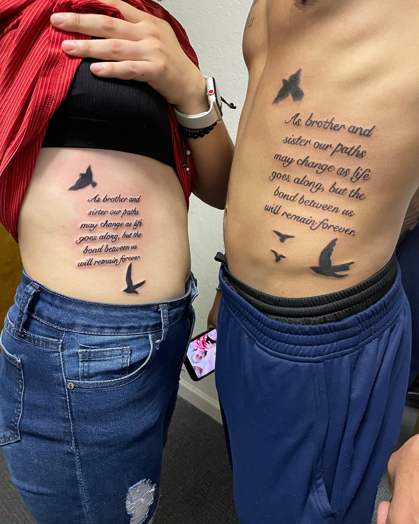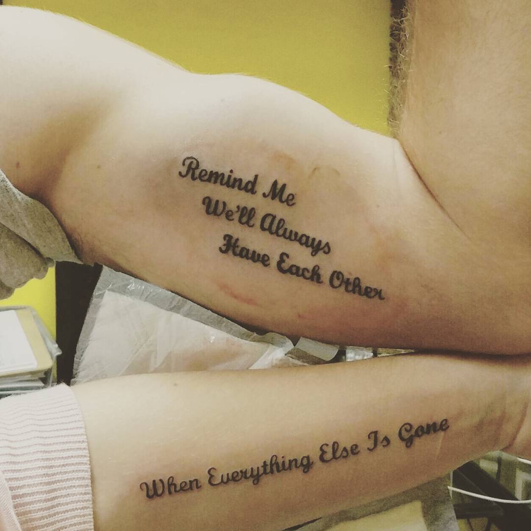 This image captures a touching moment between siblings, showcasing tattoos that express their unbreakable bond. The phrases “Remind Me We’ll Always Have Each Other” and “When Everything Else Is Gone” tell a powerful story of support and love. For those considering brother-sister tattoos, choosing meaningful words can make the design even more special.